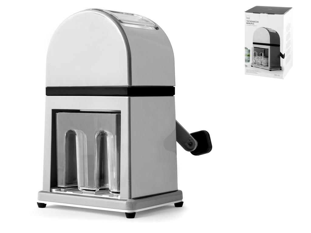 Tritaghiaccio in alluminio colore grigio con paletta servighiaccio cm14xh27. Tritura finemente i cubetti di ghiaccio per la preparazione di cocktail e bevande fresche. H&H,heh