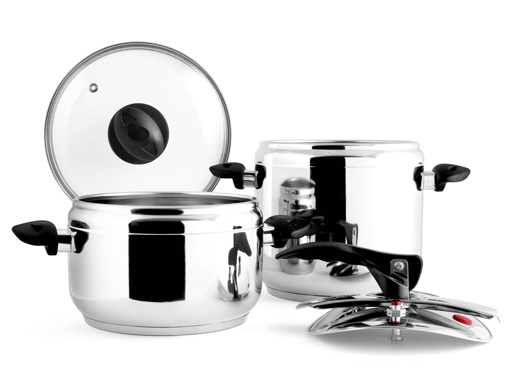 Set di 2 pentole a pressione inoxcook in acciaio inox. Composto da: 1 pentola da lt 7 di cm 34x22hx20. 5; 1 pentola da lt 5 di cm 34x22hx14; 2 coperchi intercambiabili per cottura a pressione o tradizionale. Set di pentole che saranno validi ed essenziali strumenti per la tua cucina, grazie ai materiali di qualità, alle dimensioni che consentono diverse quantità di alimenti da cucinare e alla tecnologia a pressione, per una cottura rapida e uniforme. Set dotato di un coperchio a 3 valvole in acciaio inox ed uno in vetro. Prodotto adatto a tutti i piani cottura, gas, induzione, piastre elettriche. LINEA INOXCOOK,SCONTO20