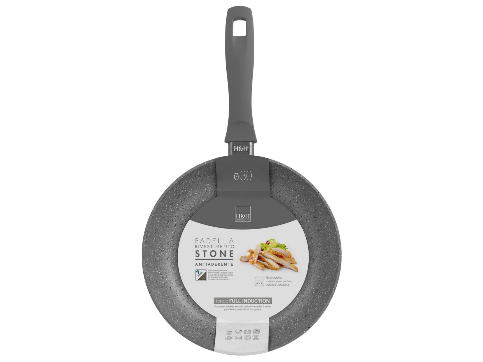 La Padella Antiaderente Stone da cm 30 è ideale per preparare piatti sani e leggeri, riducendo l'uso di grassi grazie al suo rivestimento antiaderente. La superficie garantisce una cottura uniforme e una facile pulizia, mentre il fondo adatto ai piani a induzione la rende versatile ed efficiente su tutti i tipi di piani cottura. Per ottenere i migliori risultati, evita di surriscaldare la padella a vuoto e cuoci sempre a fuoco moderato per risparmiare energia e ottenere piatti perfetti. Usa utensili in nylon, plastica o legno per preservare il rivestimento e non versare mai acqua fredda su una padella bollente. La padella è lavabile in lavastoviglie, ma si consiglia di asciugarla subito dopo il lavaggio per prolungarne la durata. LINEA STONE GREY,SCONTO15,H&H,heh