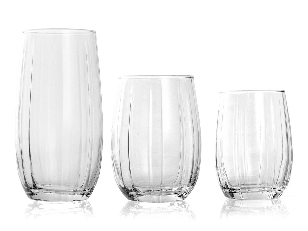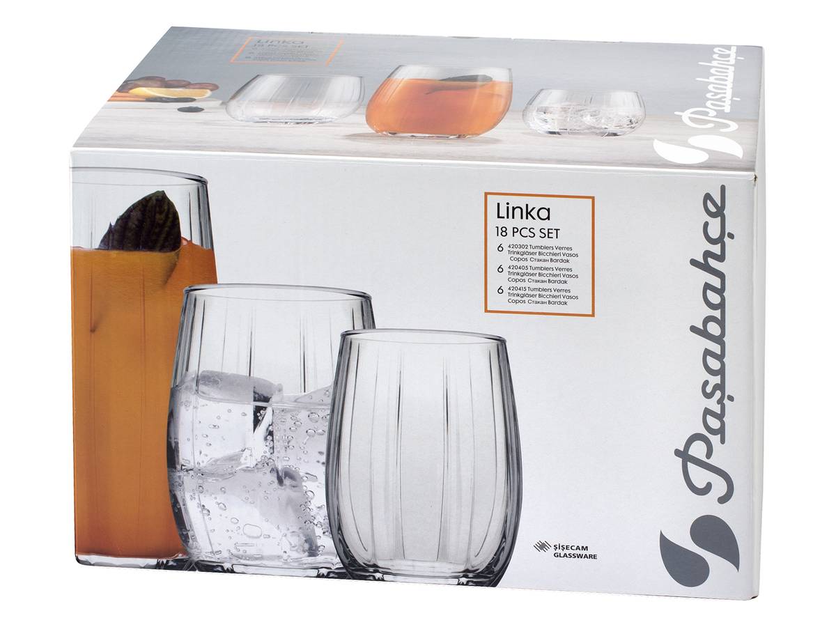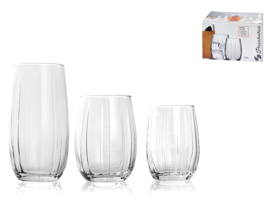 Servizio 18 pezzi Linka. Composto da 6 bicchieri bibita in vetro trasparente cc 500, 6 bicchieri acqua cc 380, 6 bicchieri vino cc 240 LINEA LINKA,Pasabahce