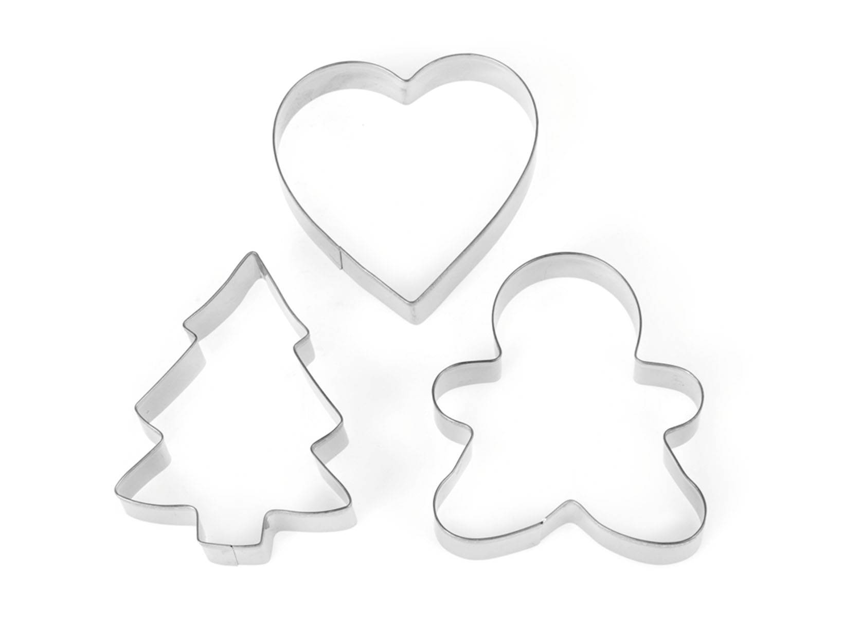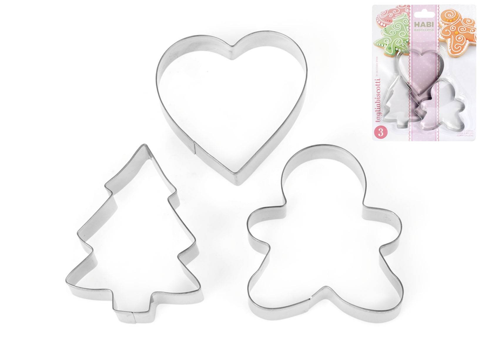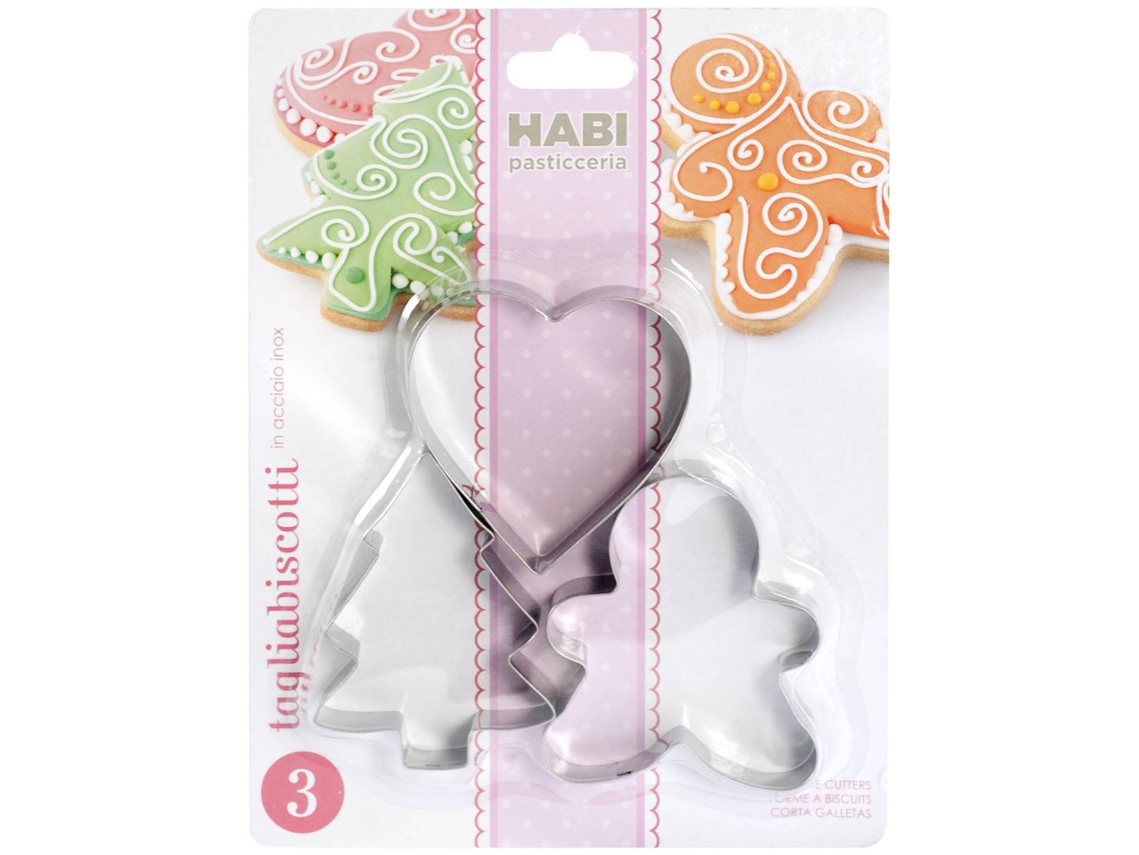 Rendi i tuoi biscotti irresistibili con il set di tagliabiscotti a forma di cuore, pino e omino di pan di zenzero, perfetti per le festività. LINEA HABI PASTICCERIA