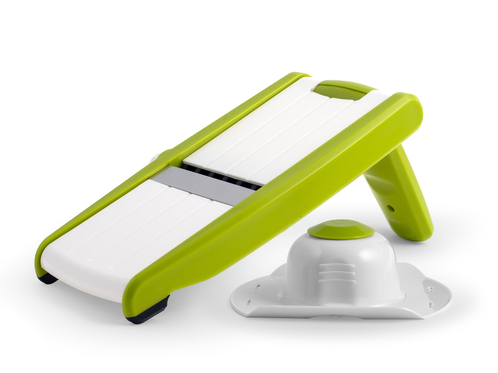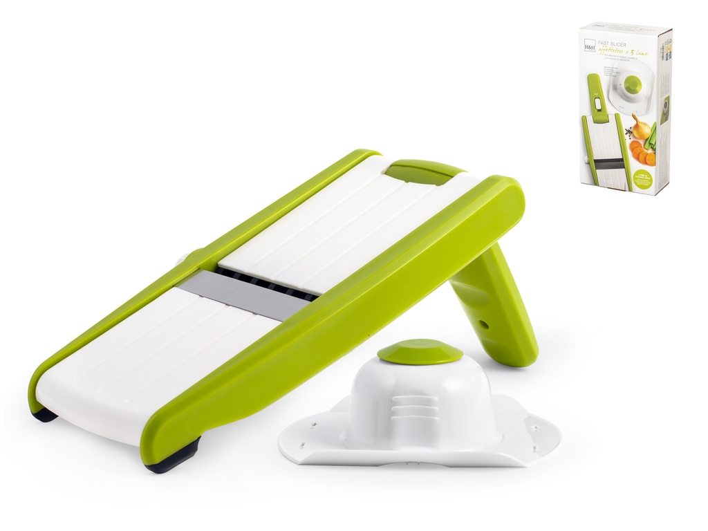 Affettatore in plastica a 3 lame in acciaio inox con salvadita. Ideale per affettare e tagliare a julienne la verdura con taglio regolabile in 5 diversi spessori. Rotella per regolare lo spessore del taglio da 1 a 9 mm. Piedini antiscivolo permettono una migliore stabilità durante l'uso. H&H,heh