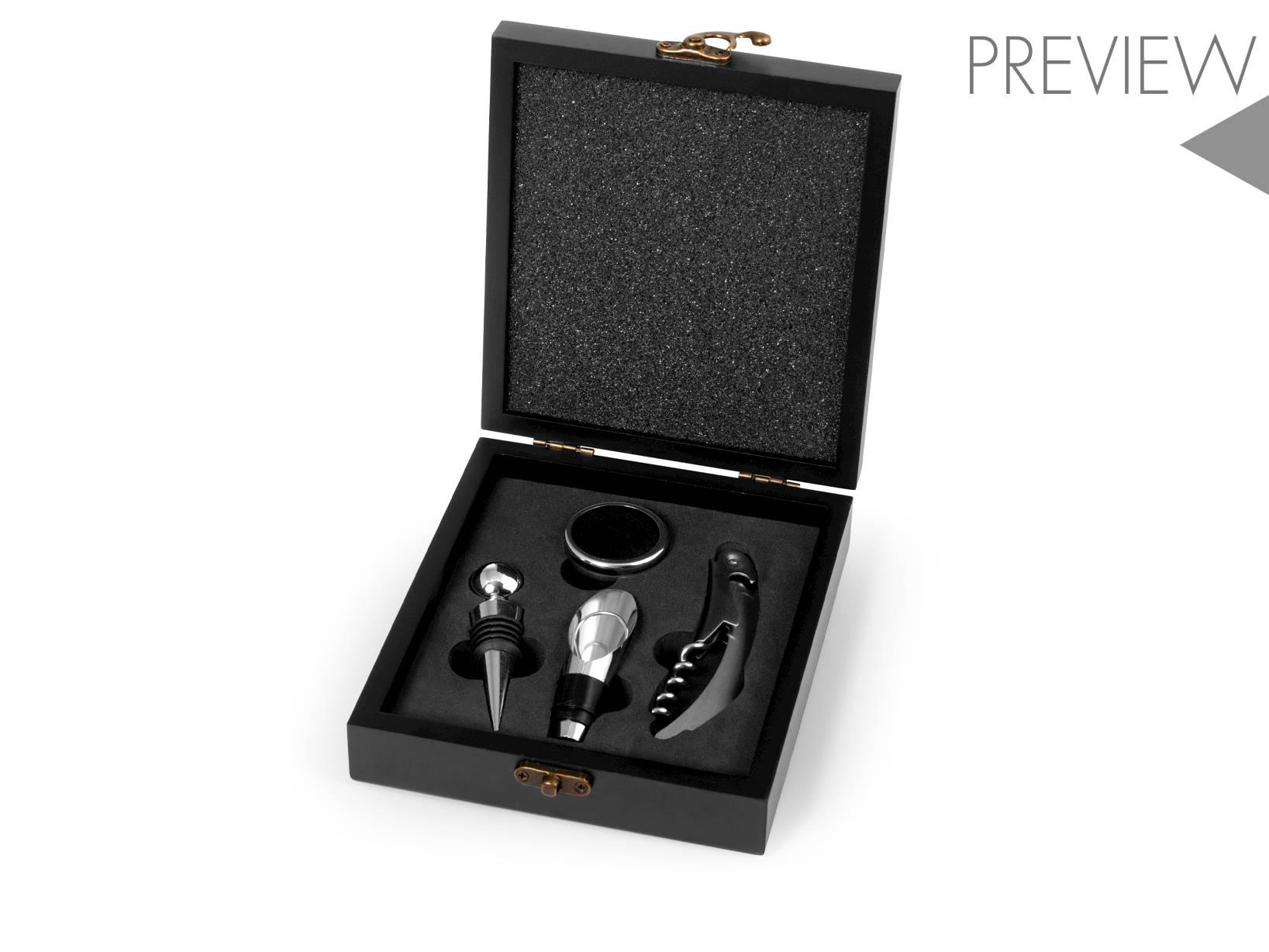 Cofanetto con 5 pezzi sommelier con gadget realizzata in legno colore nero. Composto da 1 levatappi in acciaio inox, 1 collare salvagoccia, 1 tappo bottiglia cromato,1 tappo versatore.