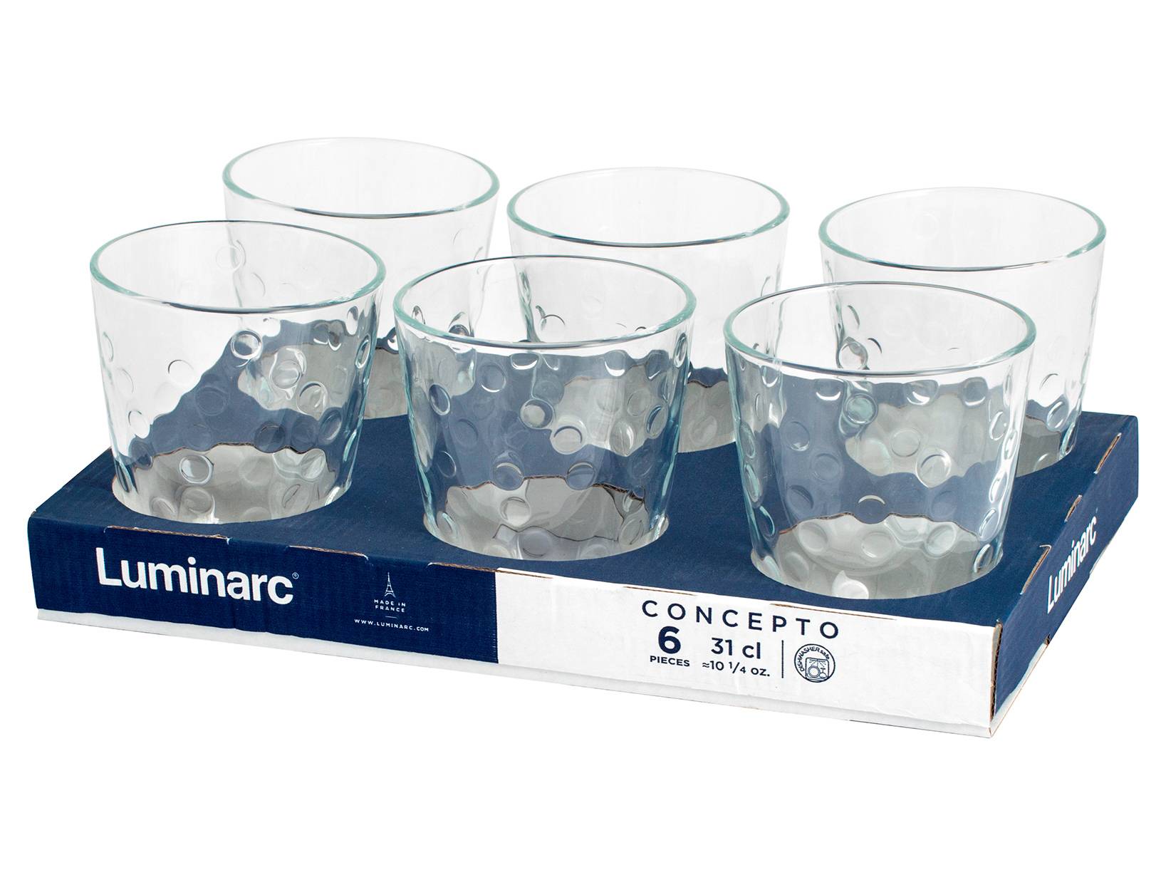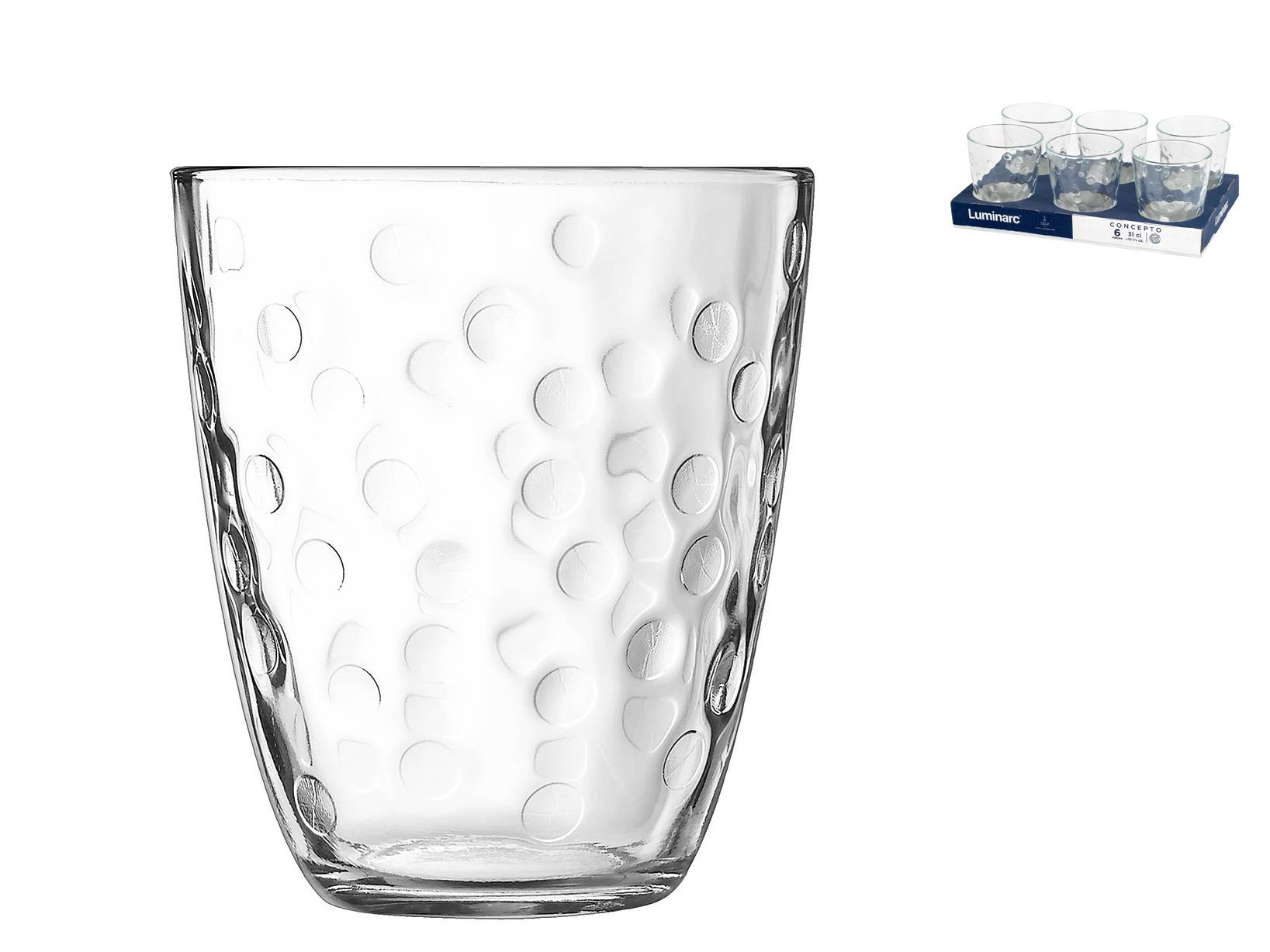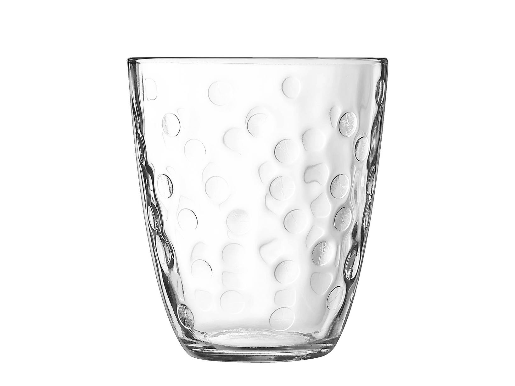 Set di 6 bicchieri concepto in vetro trasparente. Capacità: cl 31; dimensioni: 8,5x10h. Bicchieri classici con un decoro a pois in rilievo che crea un delicato effetto estetico. Comodamente lavabili in lavastoviglie.