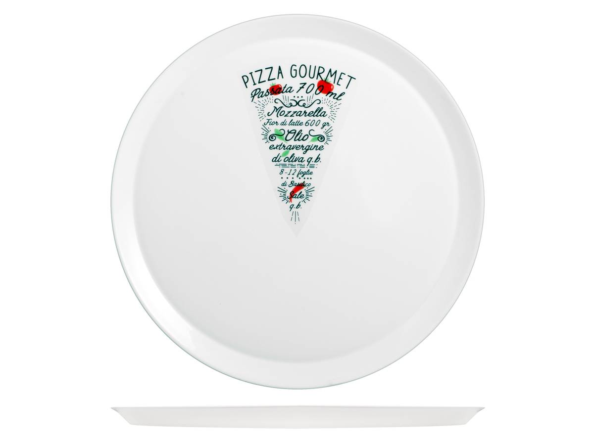 Set di 6 piatti pizza ronda in vetro opale bianco decorato. Dimensioni: cm 33. 5; piatti pizza dal decoro divertente semplice, e allegro. Il materiale è resistente e solido e li rebde adatti al comdo lavaggio in lavastoviglie. LINEA RONDA,SCONTO20,Bormioli Rocco,pizza