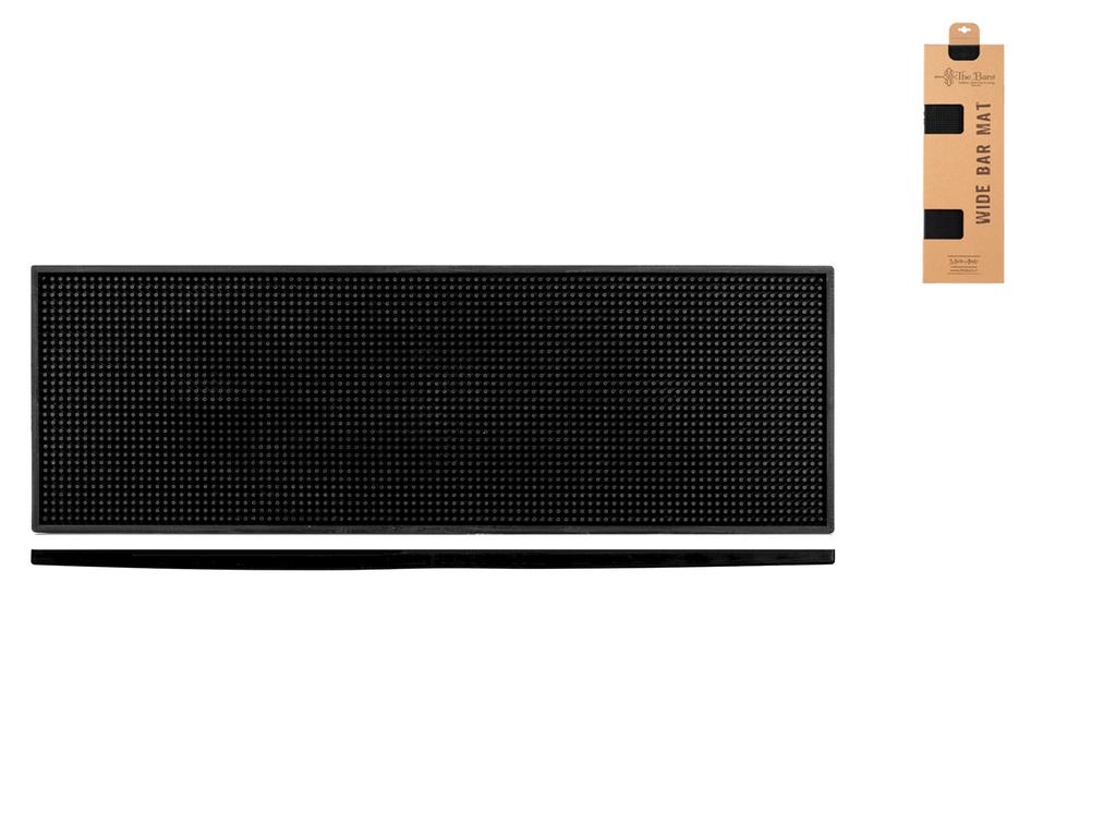 Tappeto poggia bicchieri in gomma nera. Dimensioni: cm 60x2hx20. Prodotto funzionale, elegante e professionale, ideale per permettere a bicchieri e bar tools di asciugare su di una superficie antiscivolo. LINEA THE BARS,THE BARS