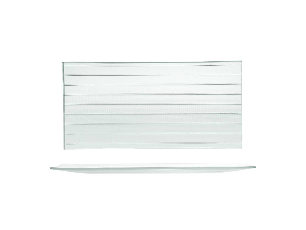 Trasforma ogni pasto in un'esperienza elegante con il nostro set di 6 piatti rettangolari in vetro riciclato. Ogni piatto misura 26x12 cm ed è impreziosito da una raffinata decorazione a righe sul fondo, che conferisce un tocco di stile e originalità alla tua tavola. Resistente e facile da pulire, è ideale per cene casual e occasioni speciali. LINEA STRIPED GLASS,H&H,heh