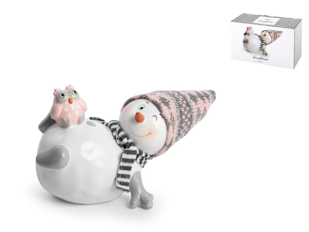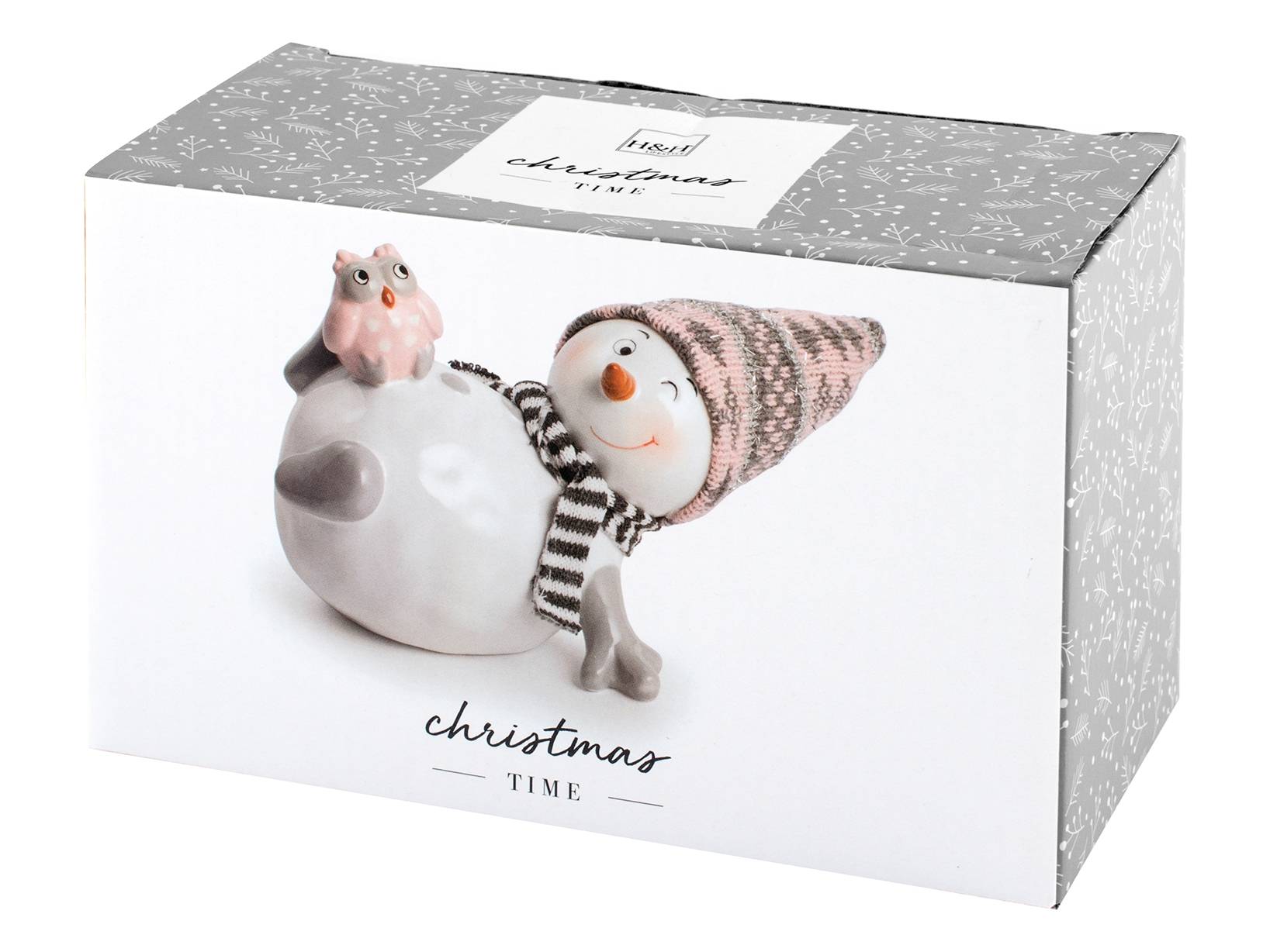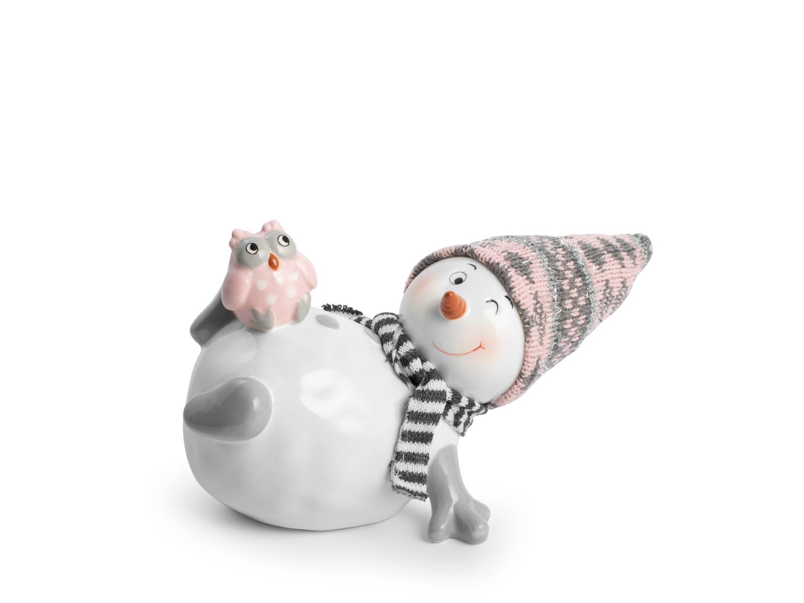 H&H Pupazzo Di Neve In Ceramica Sdraiato Colore Grigio E Rosa Cm19