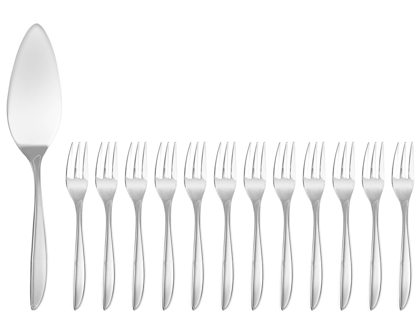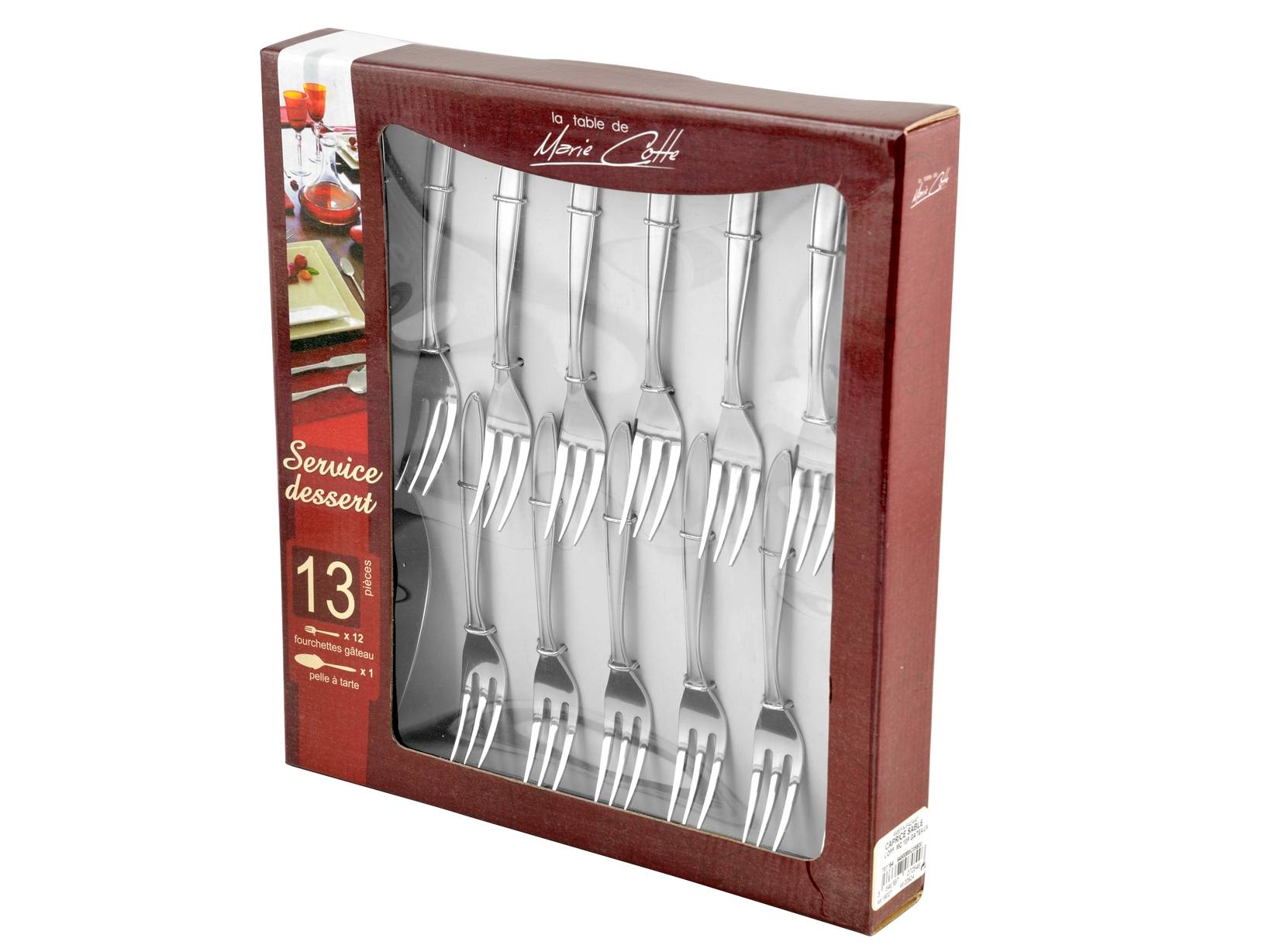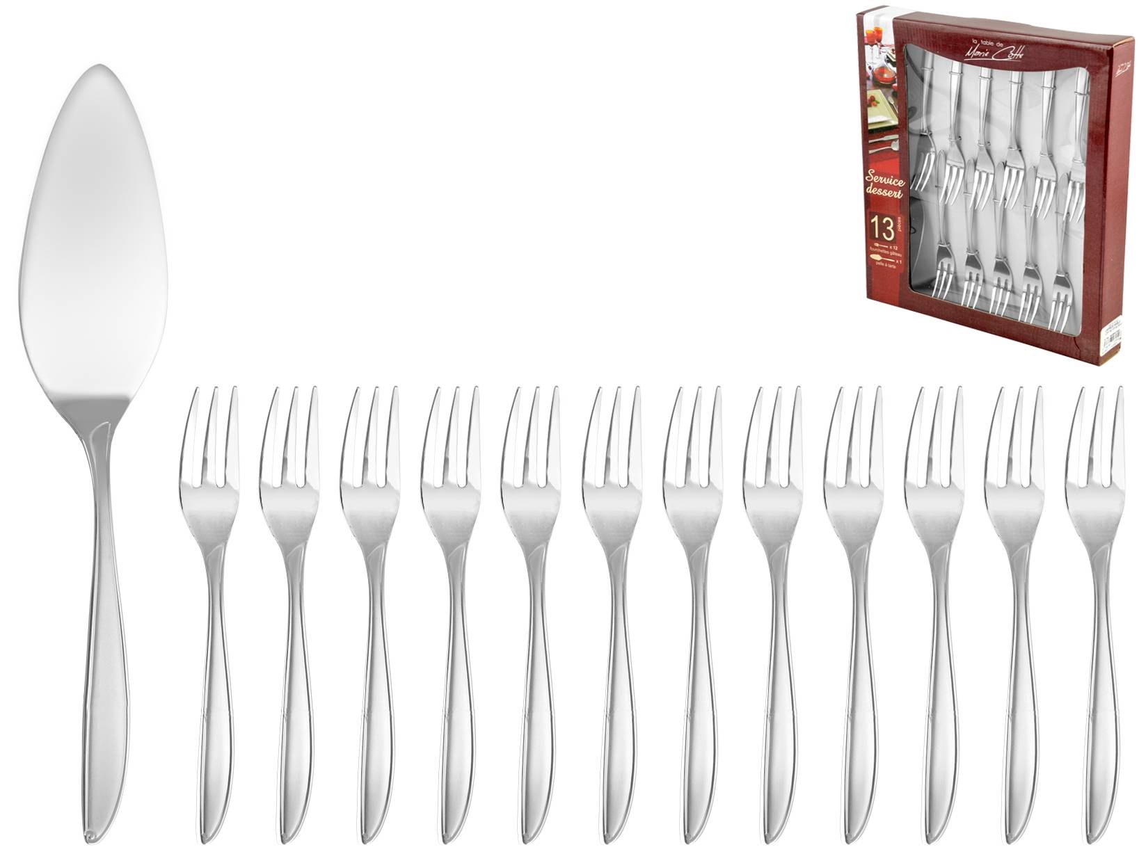 Scatola 13 pezzi posate dolce caprice in acciaio inox. Composto da: 12 forchette cm 2x2x15 peso 0,02 kg; pala dolce cm 5x3x25,5 peso 0,075kg.