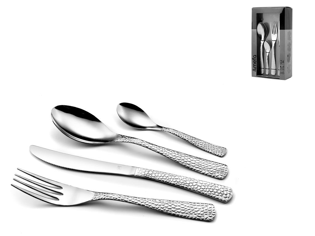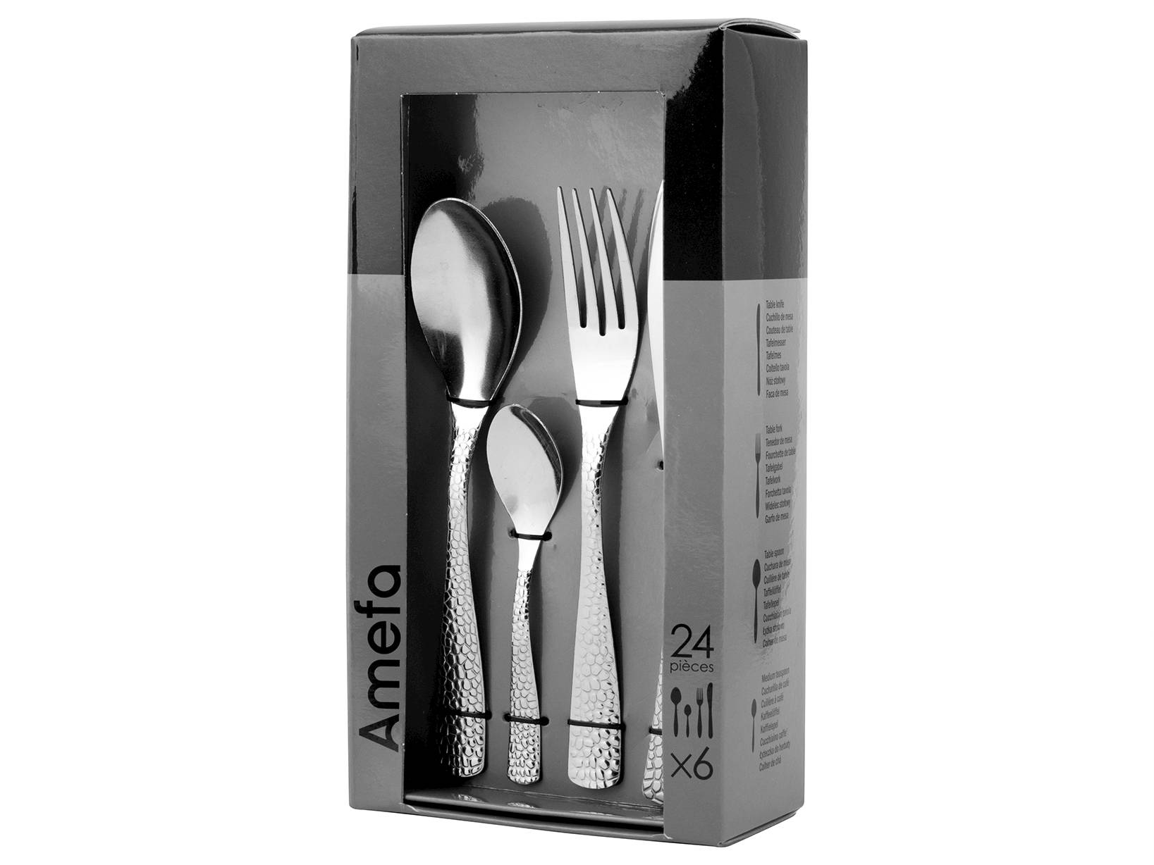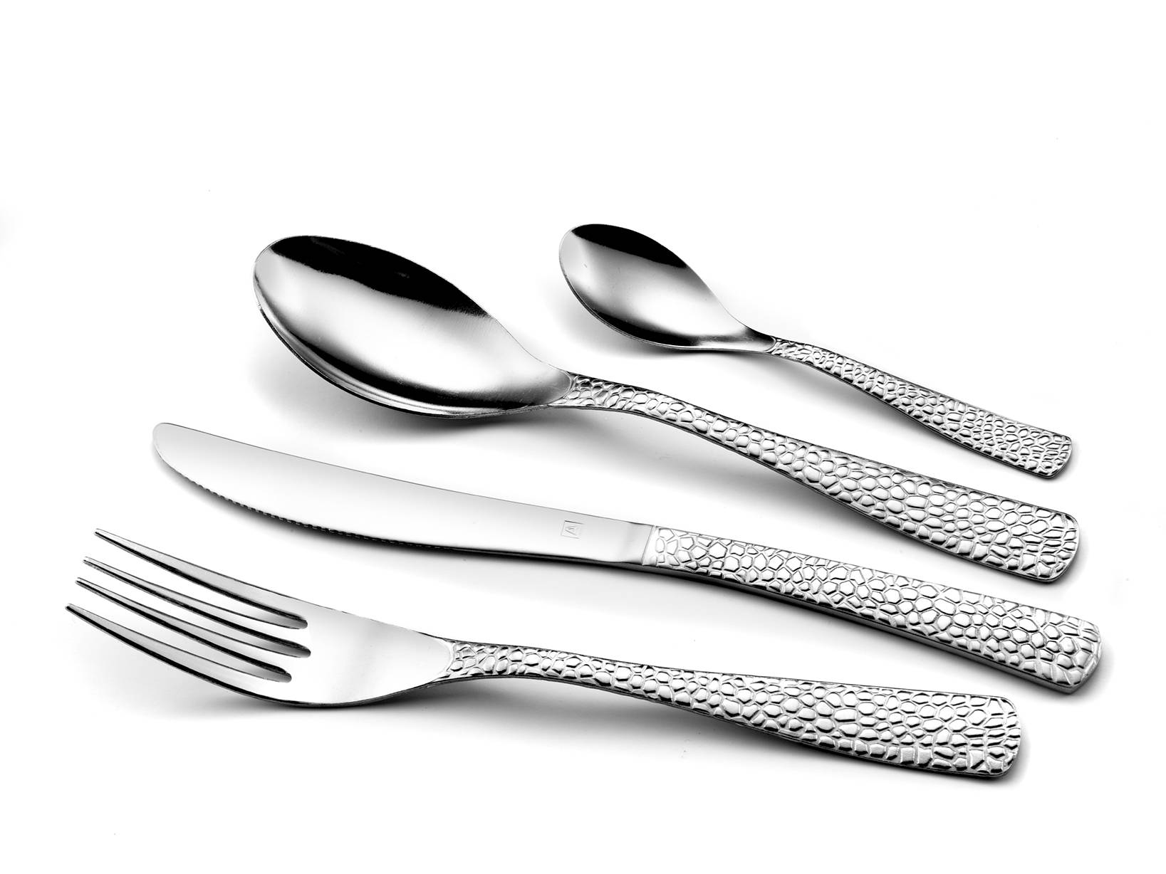 Servizio posate 24 pezzi tam tam in acciaio inox. Set composto da 6 cucchiai tavola, 6 forchette tavola, 6 coltelli tavola, 6 cucchiaini caffè. LINEA TAM TAM POSATE