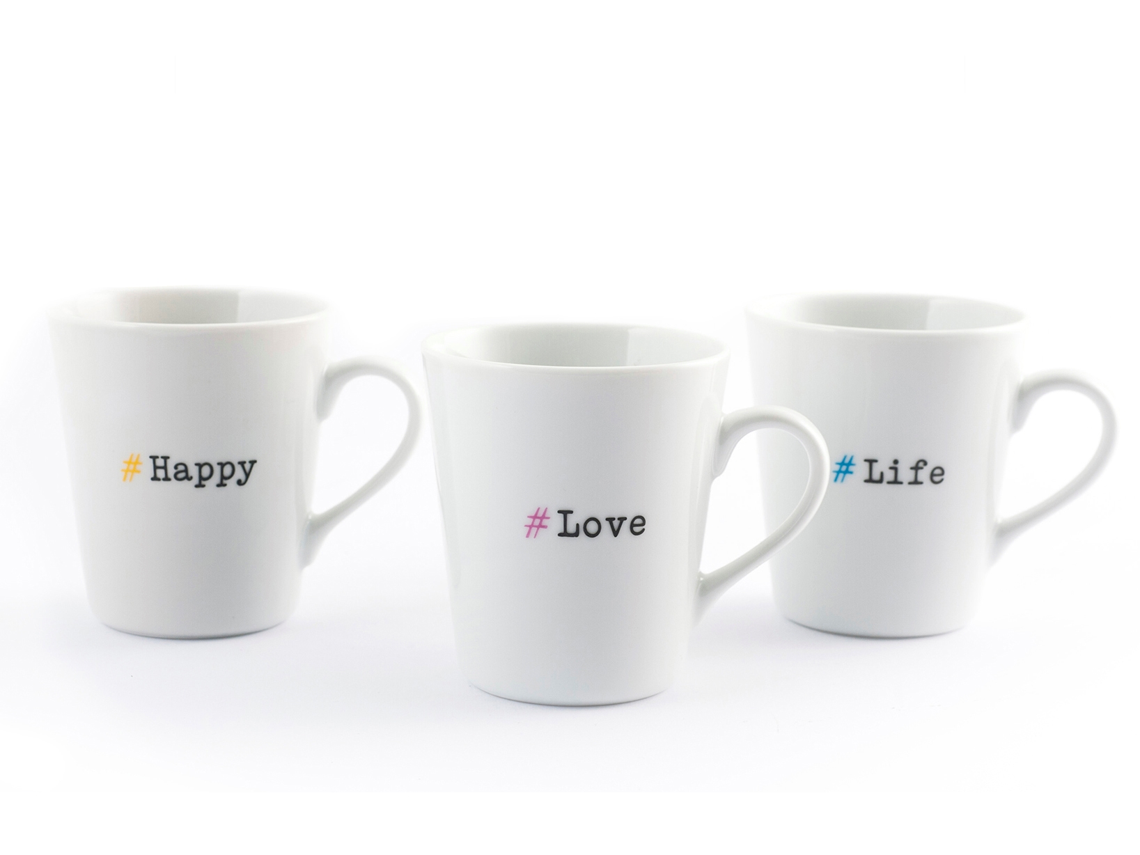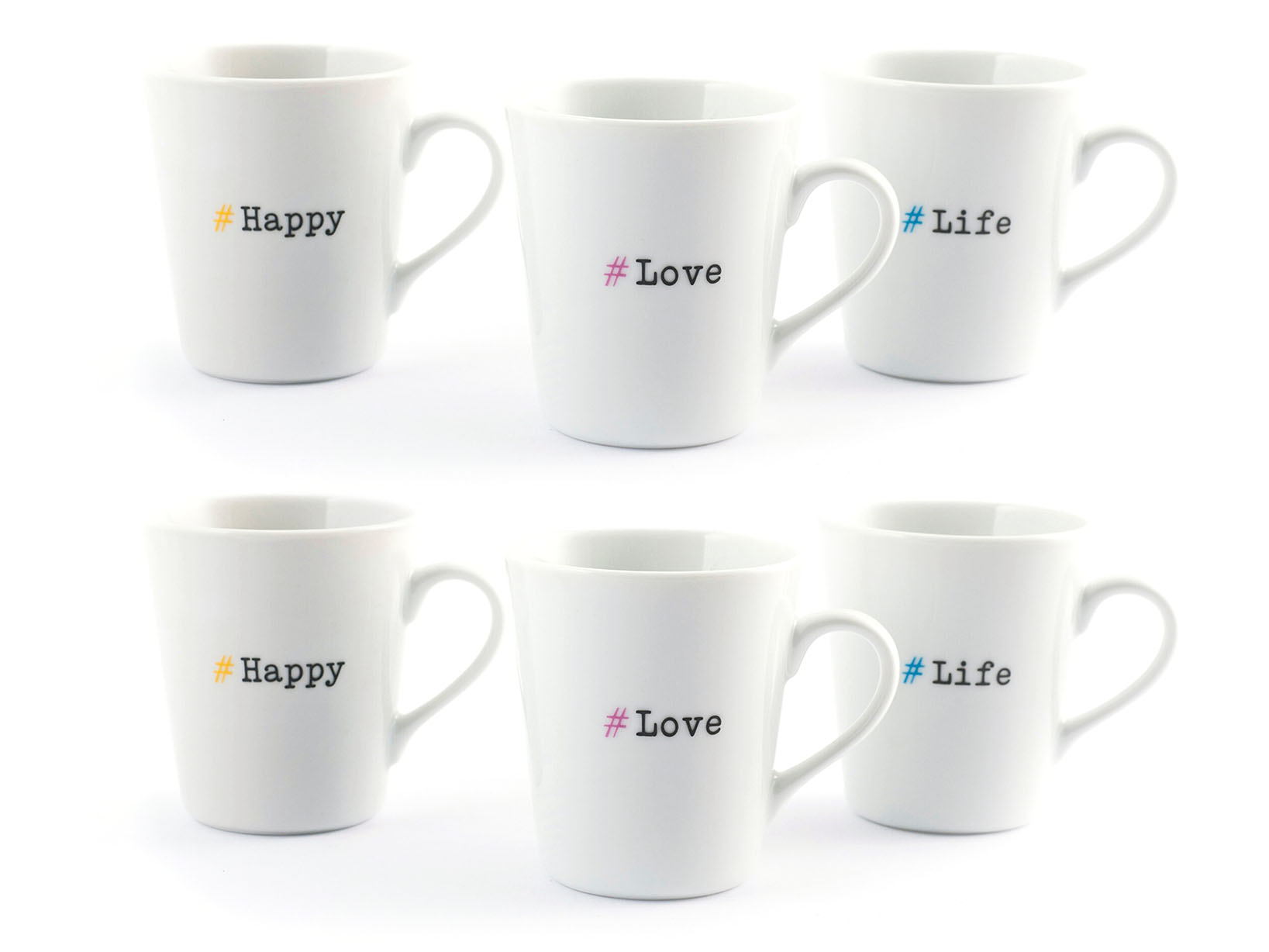 Il set di 6 mug Hashtag è realizzato in porcellana di alta qualità e presenta decorazioni assortite con scritte hashtag. Ogni mug ha una capacità di 300 cc, ideale per gustare bevande calde o fredde con un tocco di stile moderno.