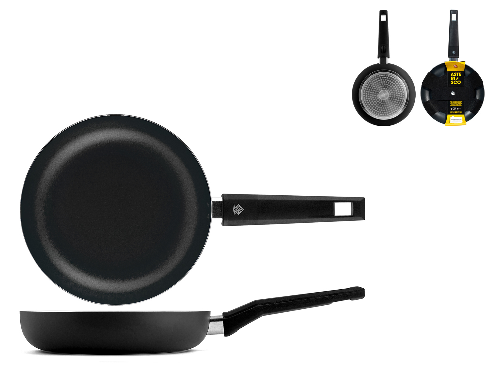 Padella asterisco in alluminio con rivestimento antiaderente, diametro 24 cm. Include un salva padella in feltro. Parte della linea Asterisco, è compatibile con tutti i piani cottura. LINEA ASTERISCO