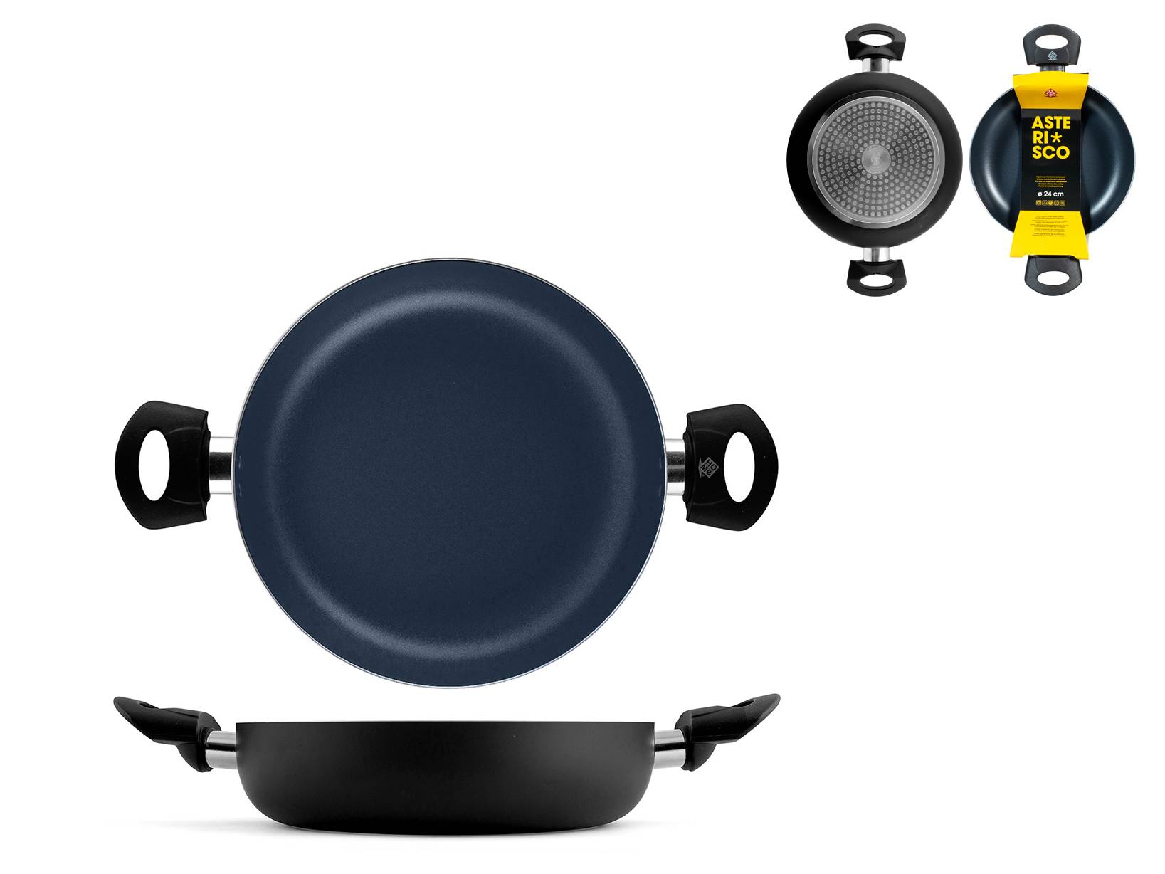 Tegame asterisco in alluminio con rivestimento antiaderente, diametro 24 cm e 2 manici. Parte della linea Asterisco, il fondo è compatibile con tutti i piani cottura. LINEA ASTERISCO