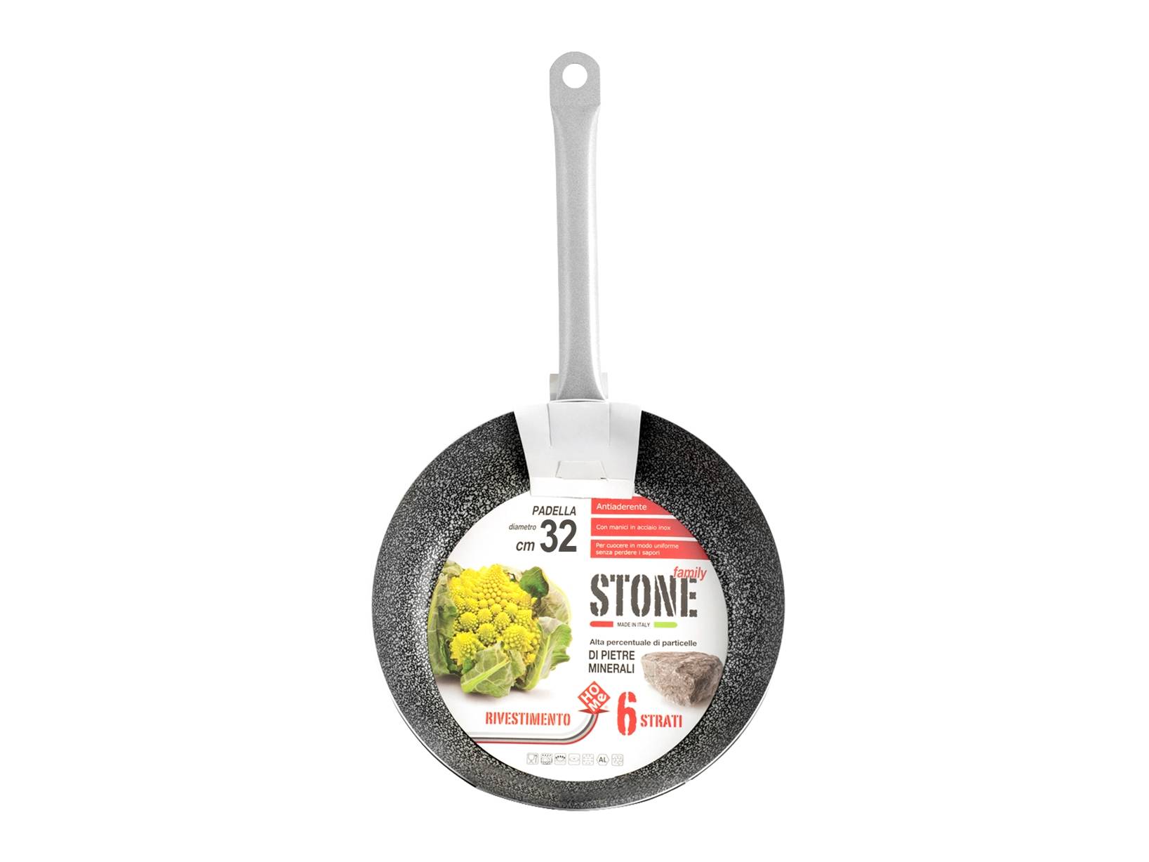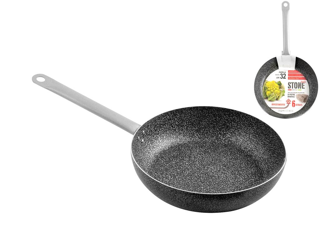 La velocita' di riscaldamento dell'alluminio si combina alla superficie resistente e antiaderente realizzata con piccole particelle di pietra, rivestimento a 6 strati. La collezione family e' caratterizzata da grandi dimensioni di pentole e padelle, specifiche per la preparazione di pietanze per piu' di 4 persone. LINEA FAMILY STONE