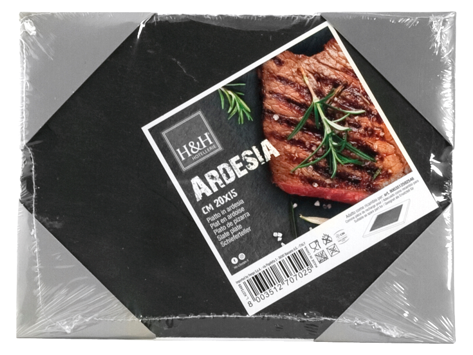 Elegante set di piatti rettangolari in ardesia con dimensioni di 20x15 cm, spessore di 0,5 cm. Perfetti per presentare antipasti e porzioni piccole con uno stile raffinato. Ogni piatto è unico grazie alle venature naturali dell'ardesia. LINEA ARDESIA,H&H,heh