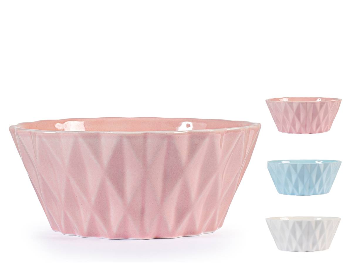 Set di 6 bowl "Diamante" in New Bone China, con una capacità di 320 cc. Disponibili in colori pastello assortiti come rosa confetto, azzurro tenue e bianco, queste ciotole presentano superfici sfaccettate che donano un tocco di modernità ed eleganza. I colori delicati creano un'atmosfera rilassante e raffinata, rendendole ideali per servire dessert, zuppe o insalate. H&H,heh