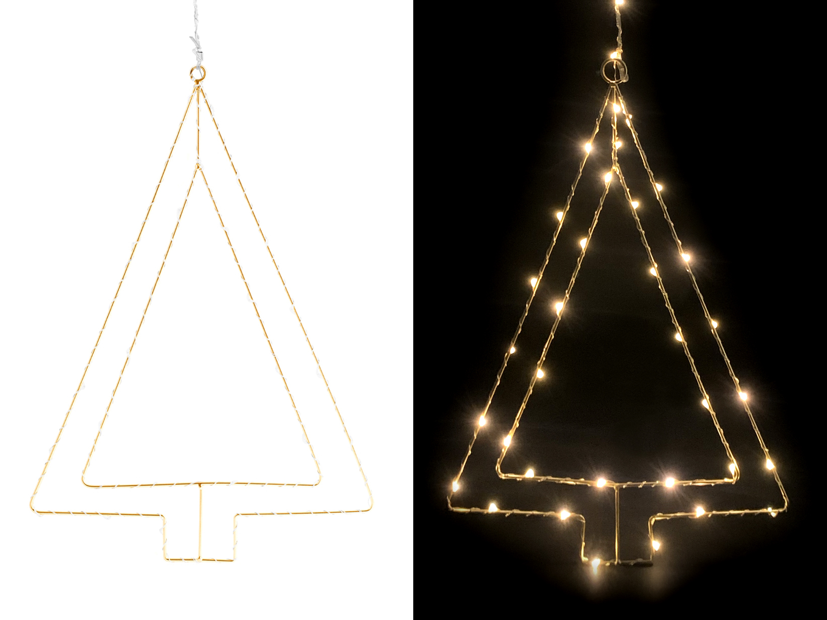 Questo elegante albero in metallo moderno da appendere, alto 42 cm, è illuminato da LED che aggiungono un tocco di luminosità al tuo spazio natalizio. Le batterie AAA non sono incluse. H&H,heh