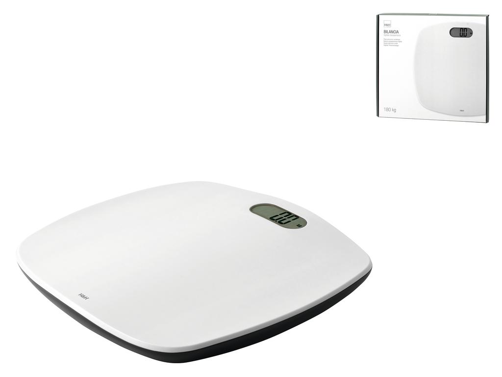 Pesapersone digitale in plastica di colore bianco. Peso massimo di 180kg, con sensore ad alta precisione, gommini antiscivolo, segnalatore di batteria scarica e peso eccessivo. Batterie 2 di AAA non incluse. H&H,heh