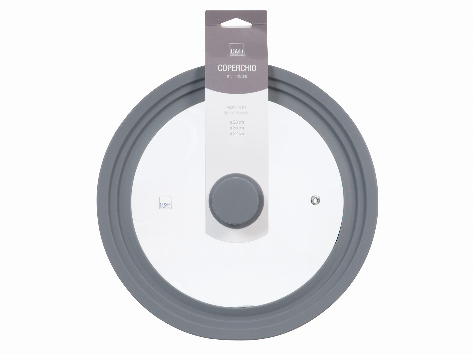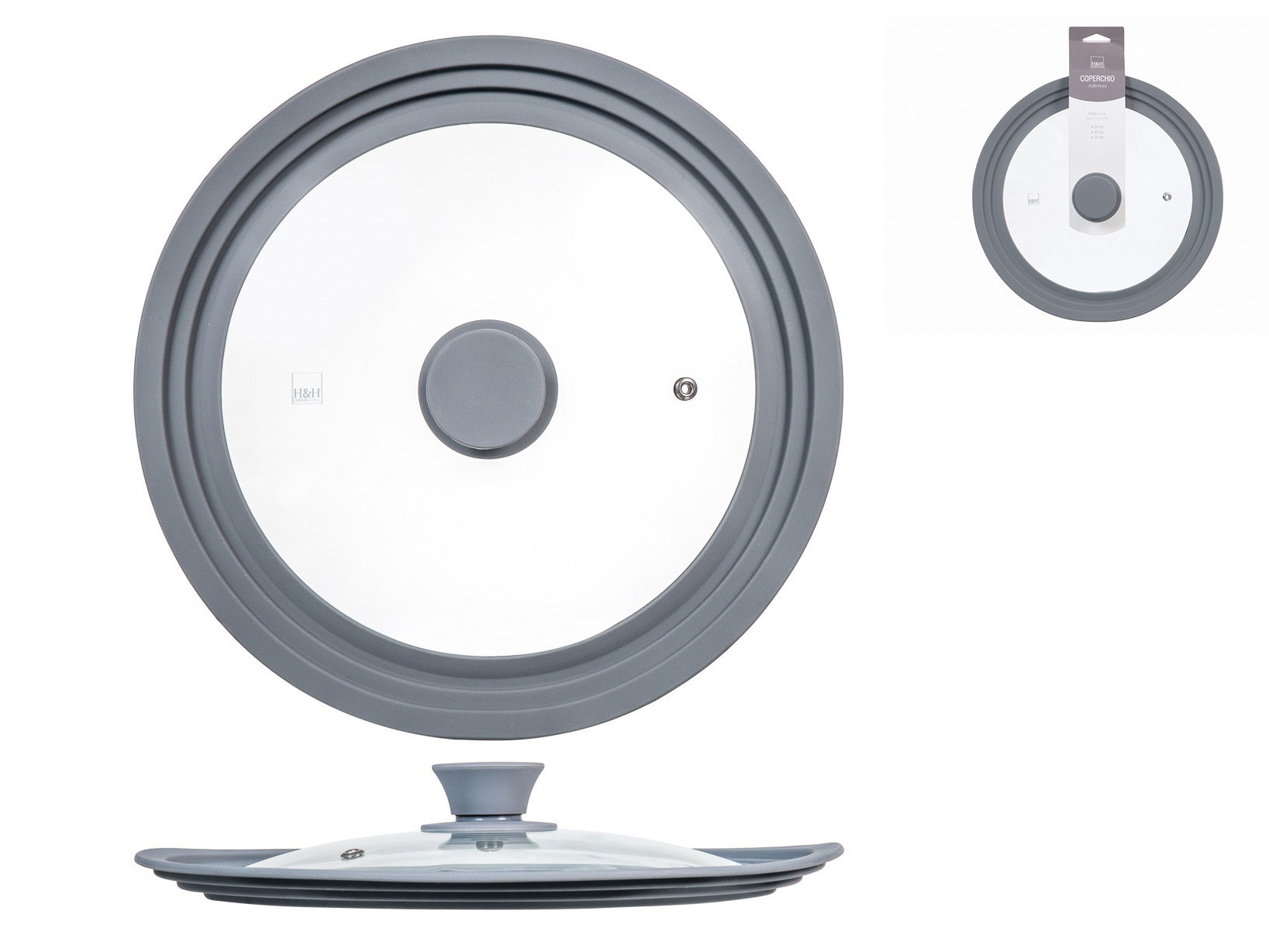 Adatta la tua cucina con il coperchio multimisura in vetro, perfetto per pentole di diverse grandezze. Il bordo in silicone garantisce una chiusura sicura, mantenendo i cibi caldi e gustosi. Con tre misure diverse, questo coperchio offre una flessibilità eccezionale e una soluzione pratica per ogni esigenza culinaria. LINEA MULTIMISURA,H&H,heh