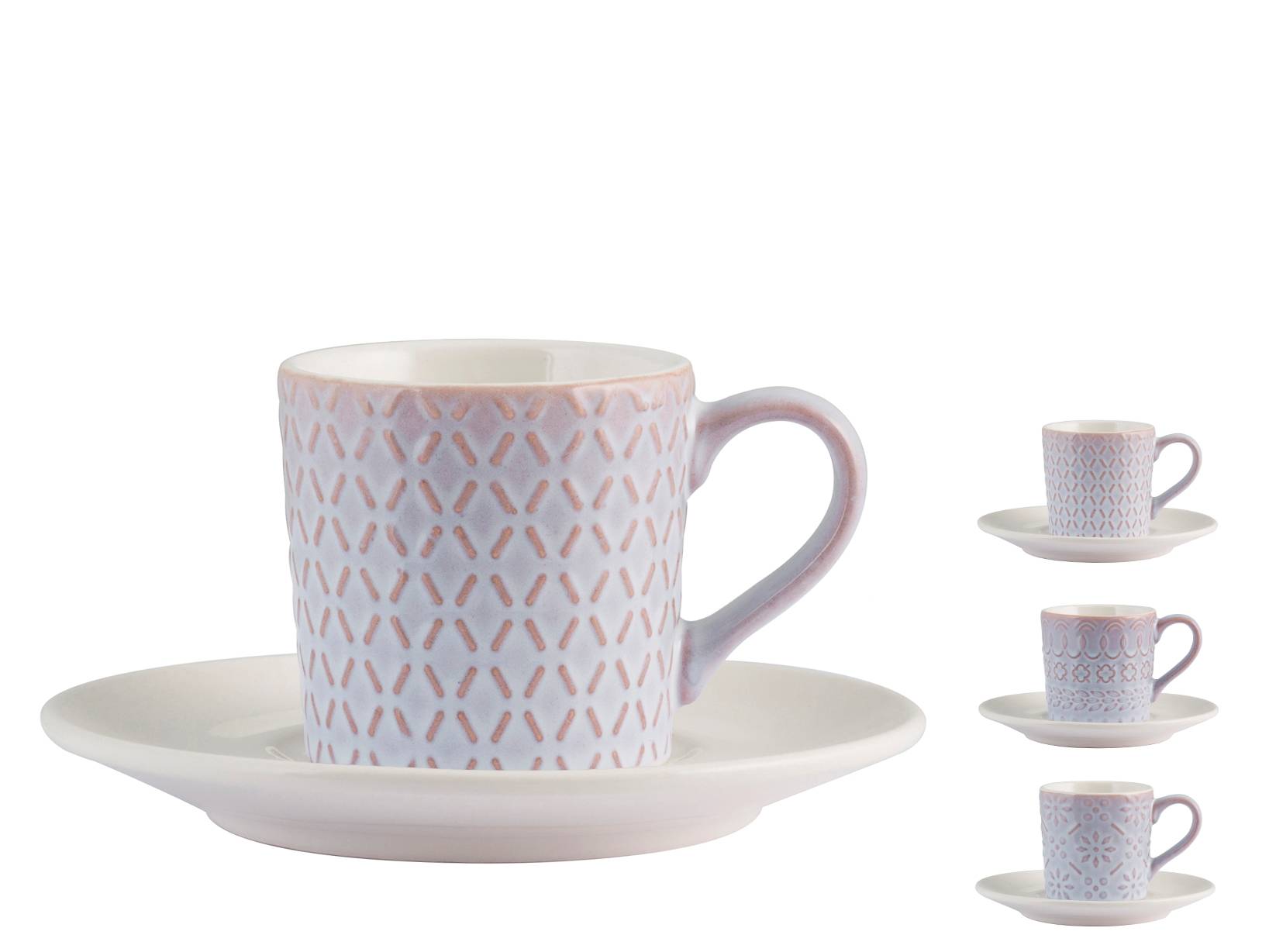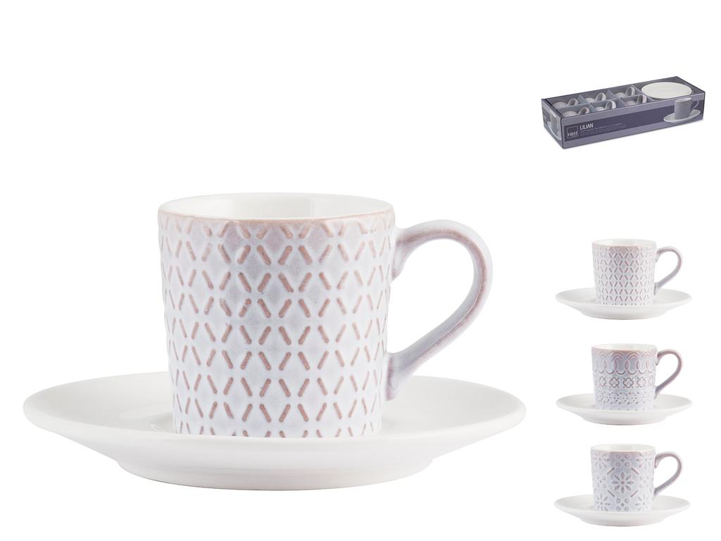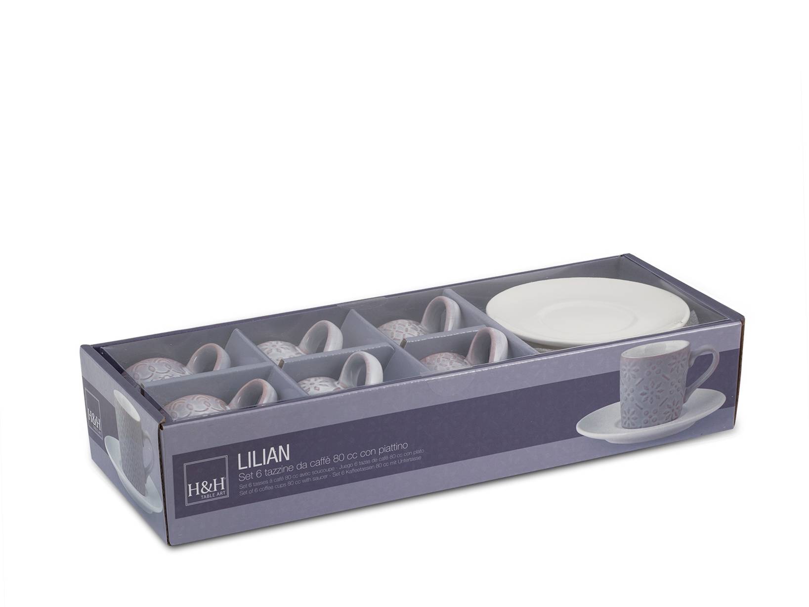 Confezione di 6 tazze caffè in stoneware lilian senza piatto cc80un'idea regalo utile e ricercata? le tazze lilian! giocano con le tonalità del lilla e il colore caldo della terracotta che emerge dalle decorazioni in rilievo sull'esterno della tazza mentre l'interno resta di un immancabile bianco caldo. Ci accompagneranno durante la giornata: dalla colazione del mattino, al caffè del dopo pranzo fino alla tisana della sera. Disponibili nei formati da tè, caffè, tazzone, mug e in confezione regalo: set caffè e set tè, entrambi con pi. LINEA LILIAN,H&H,heh