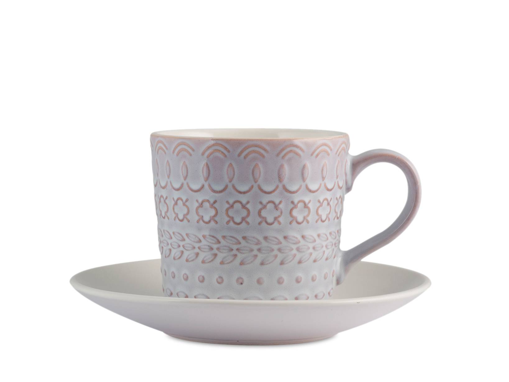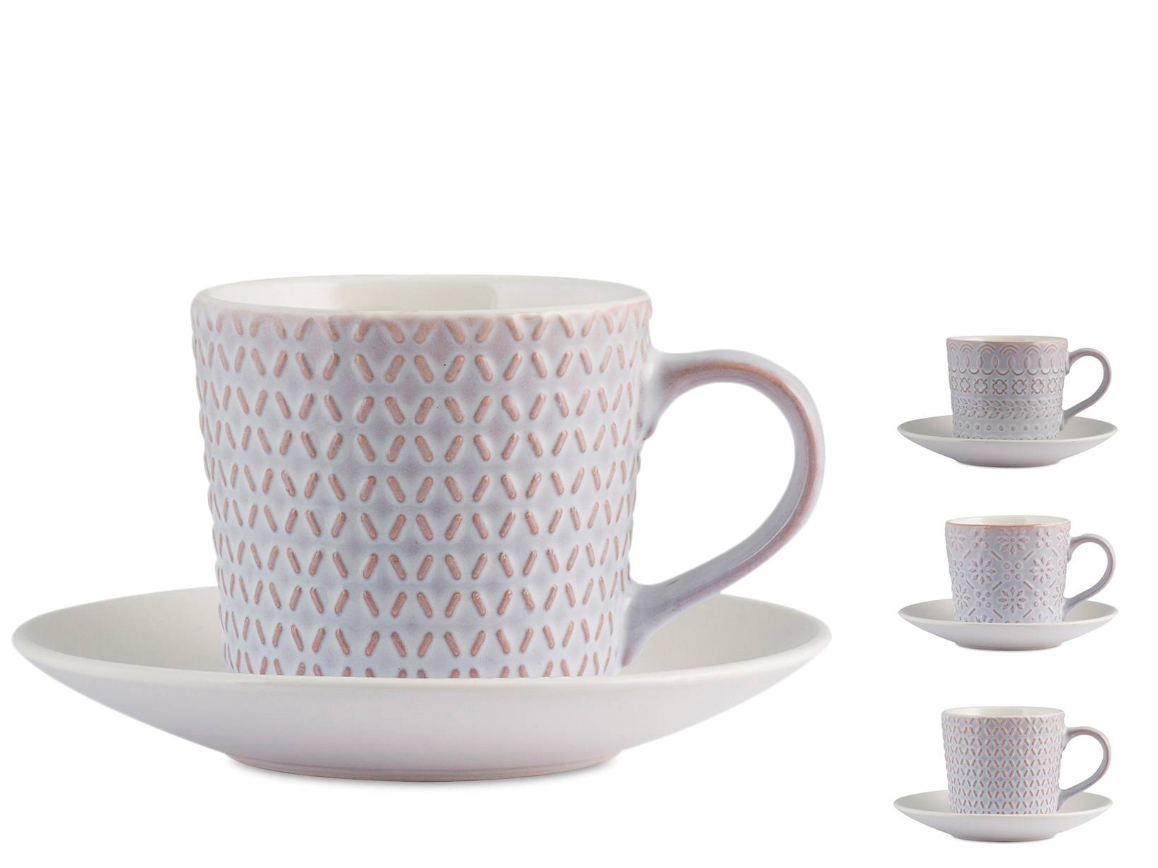 Set 6 tazze tè lilian in stoneware con piattino cc200. Un'idea regalo utile e ricercata? le tazze lilian! giocano con le tonalità del lilla e il colore caldo della terracotta che emerge dalle decorazioni in rilievo sull'esterno della tazza mentre l'interno resta di un immancabile bianco caldo. Ci accompagneranno durante la giornata: dalla colazione del mattino, al caffè del dopo pranzo fino alla tisana della sera. LINEA LILIAN,SCONTO15,H&H,heh
