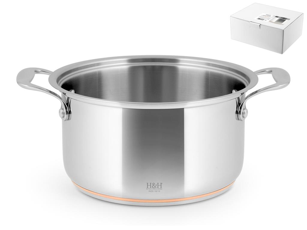 L'acciaio inox 18/10 e' ideale per le cotture in cui il calore e' trasmesso dall'acqua, quali la bollitura o la cottura a vapore per esempio. Il triplo fondo distribuisce e mantiene costante il calore. La collezione si completa con tegami, pentole, bollilatte e coperchi. Triplo fondo con inserto centrale in rame. LINEA INOX RAME,H&H,heh