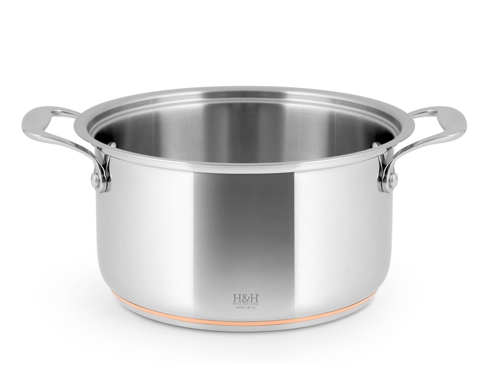 L'acciaio inox 18/10 e' ideale per le cotture in cui il calore e' trasmesso dall'acqua, quali la bollitura o la cottura a vapore per esempio. Il triplo fondo distribuisce e mantiene costante il calore. La collezione si completa con tegami, pentole, bollilatte e coperchi. Triplo fondo con inserto centrale in rame. LINEA INOX RAME,INOX RAME,H&H,heh