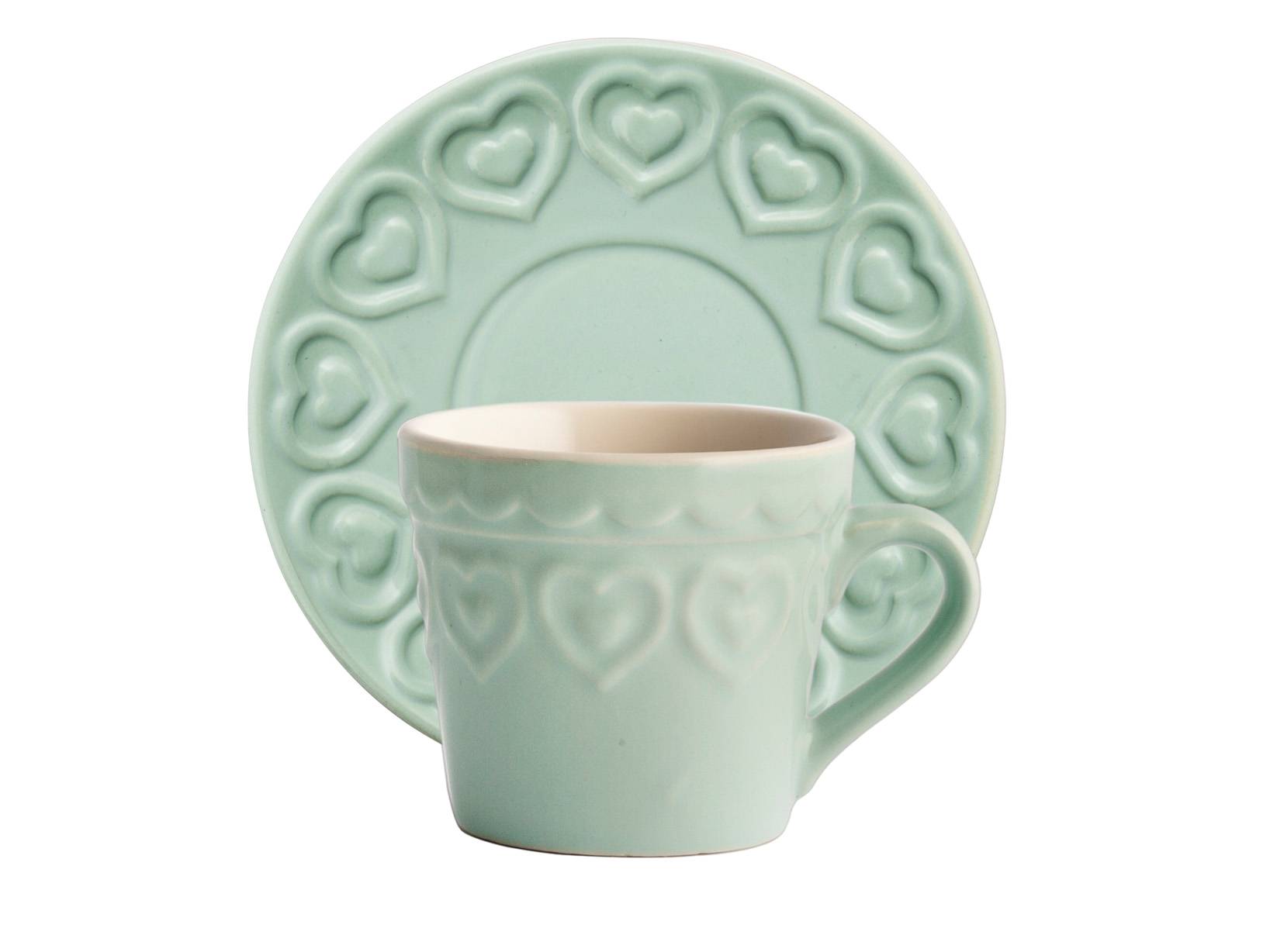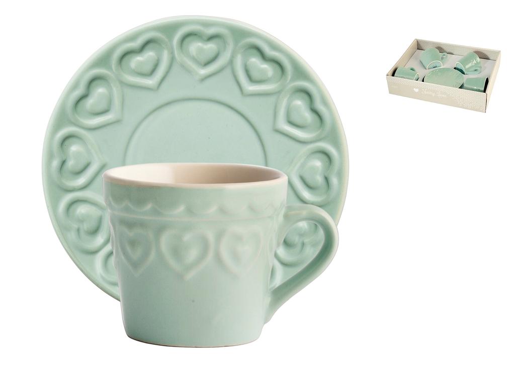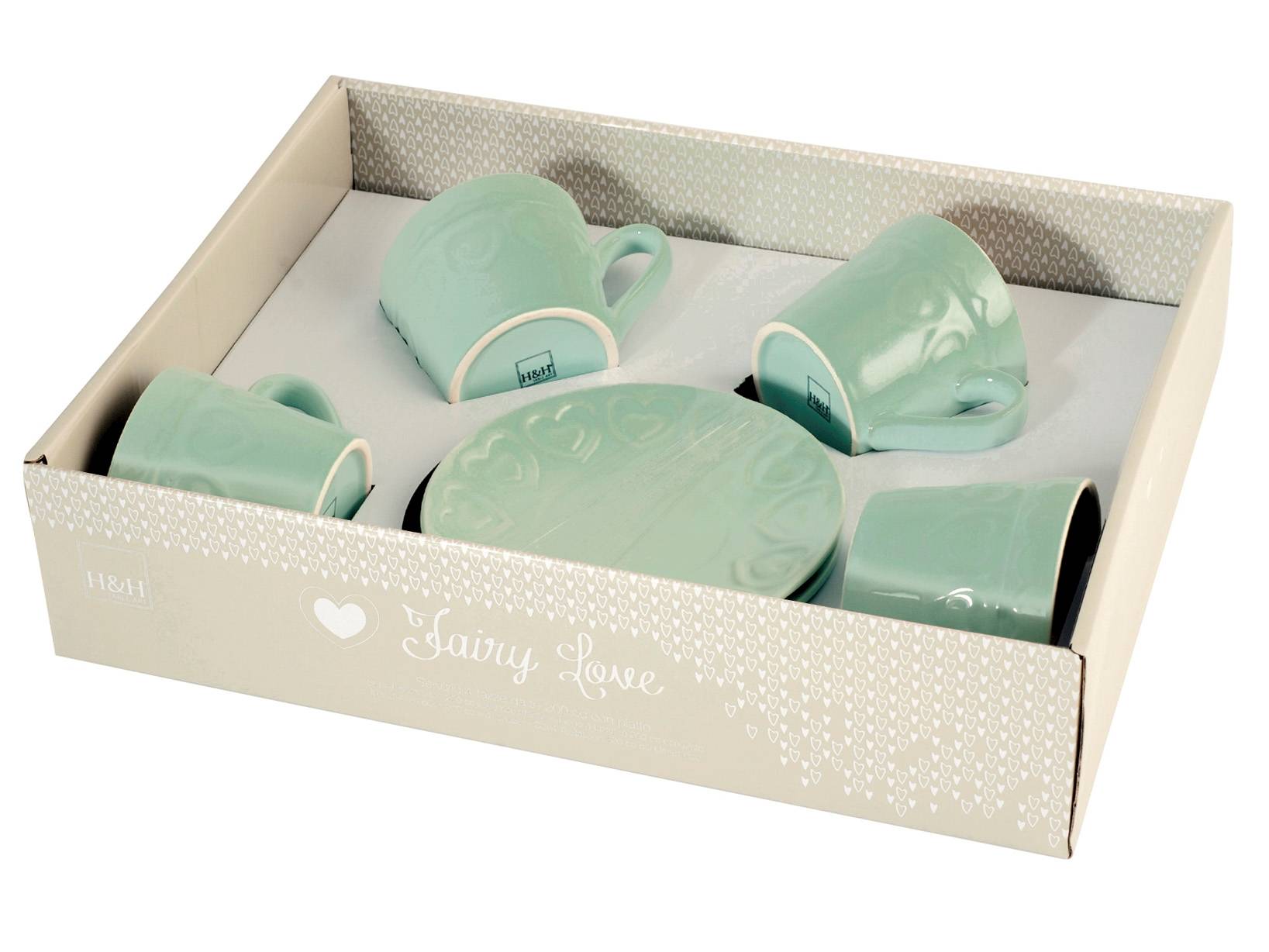 Servizio di 4 tazze da tè fairylove aquamarina in stoneware con piattini cc200. La collezione fairylove e' romanticamente shabby chic. Bordi decorati con cuori in rilievo, colori pastello e qualche pasticcino al burro renderanno il te' delle cinque raffinato e ricco di charme. Le tazze sono disponibili in 3 colori: rosa, verde acqua e tortora. LINEA FAIRY LOVE,H&H,heh,SAN VALENTINO