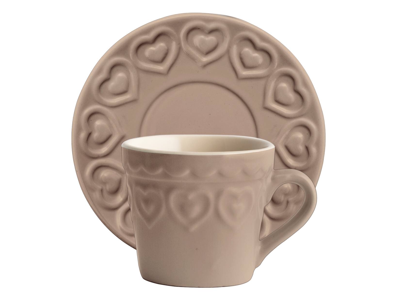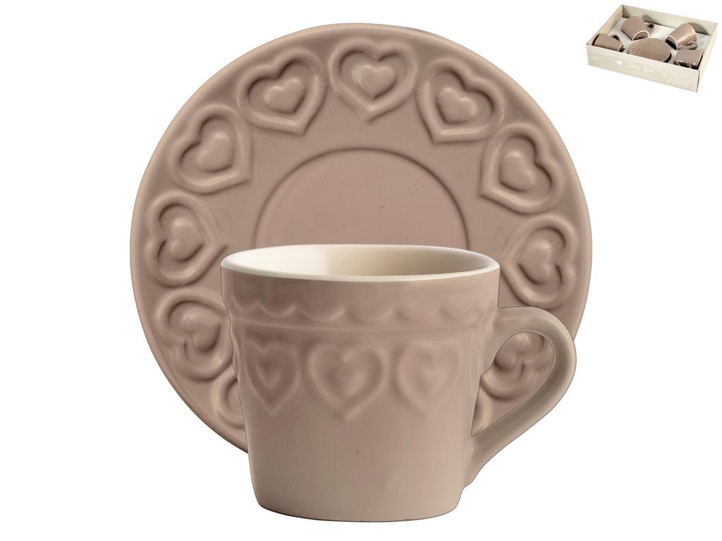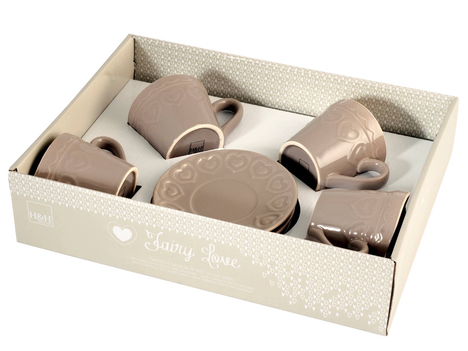 Collezione di 4 tazze tè fairylove tortora in stoneware con piattini cc200la collezione fairylove e' romanticamente shabby chic. Bordi decorati con cuori in rilievo, colori pastello e qualche pasticcino al burro renderanno il te' delle cinque raffinato e ricco di charme. LINEA FAIRY LOVE,SCONTO15,H&H,heh,SAN VALENTINO