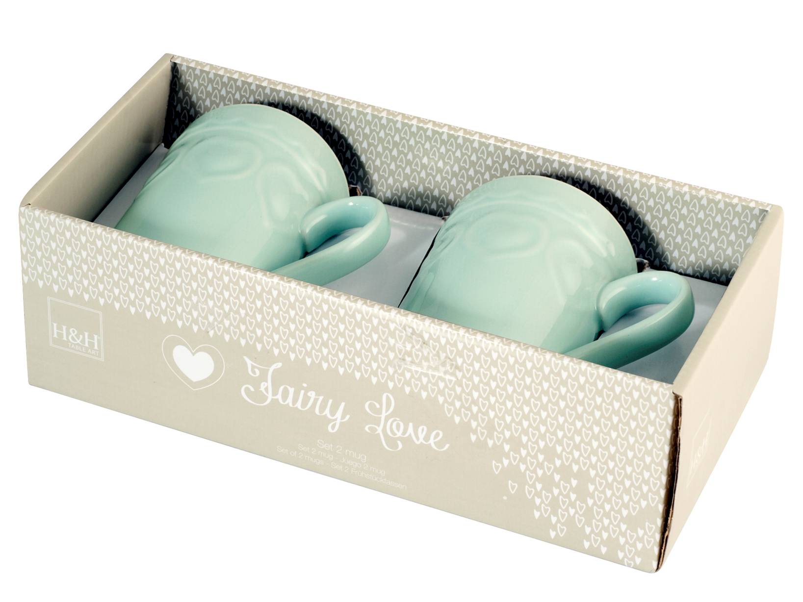La collezione fairylove e' romanticamente shabby chic. Bordi decorati con cuori in rilievo, colori pastello e qualche pasticcino al burro renderanno il te' delle cinque raffinato e ricco di charme. Le tazze sono disponibili in 3 colori: rosa, verde acqua e tortora, in set da 4 tazze con piattino per la versione caffe' e te, le mug sono disponibili in set da 2 e per completare la linea un accessorio indispensabile in cucina: il posamestolo. LINEA FAIRY LOVE,bomboniere,H&H,heh,SAN VALENTINO