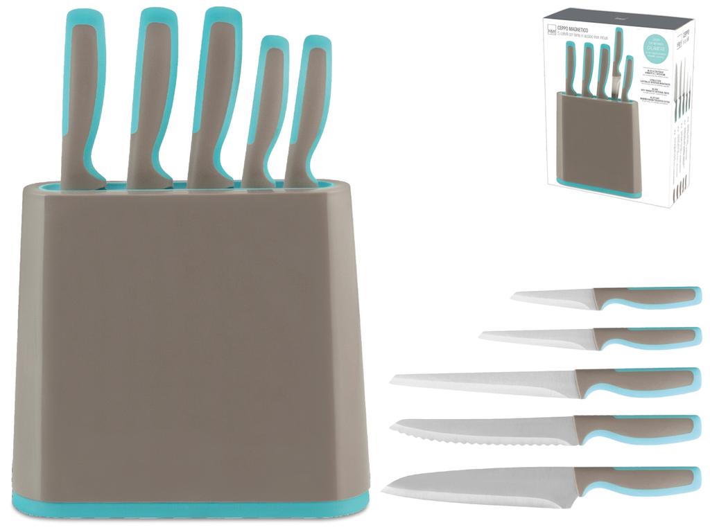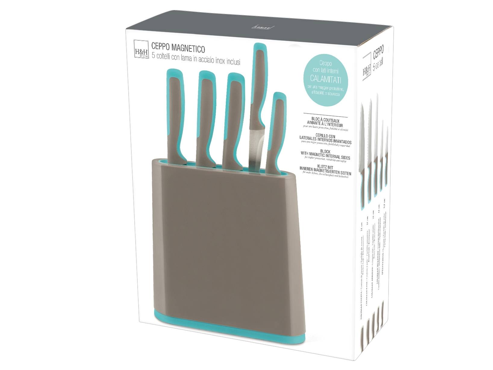 In cucina e' importante avere gli strumenti giusti a portata di mano, il ceppo porta coltelli permette di avere a disposizione il coltello adatto ad ogni preparazione: per sfilettare il pesce, tagliare la carne, affettare il pane e pulire la verdura per esempio. Questo ceppo ha i lati interni calamitati, per una maggior protezione, affidabilita' e sicurezza, lame in acciaio inox. Set coltelli: da cucina, pane e arrosto con lama da 21 cm, multiuso con lama da 13 cm e spelucchino con lama da 9,5 cm. Disponibile in 2 colori. H&H,heh
