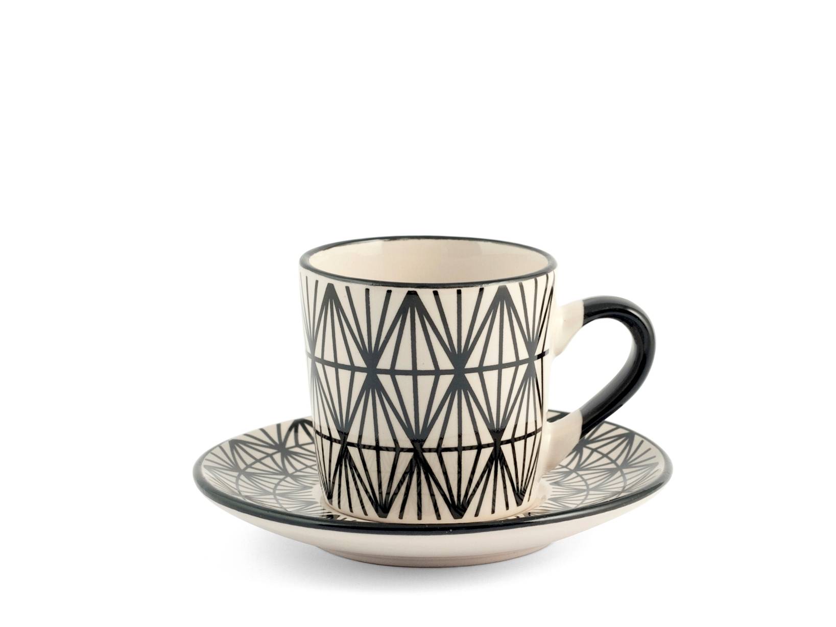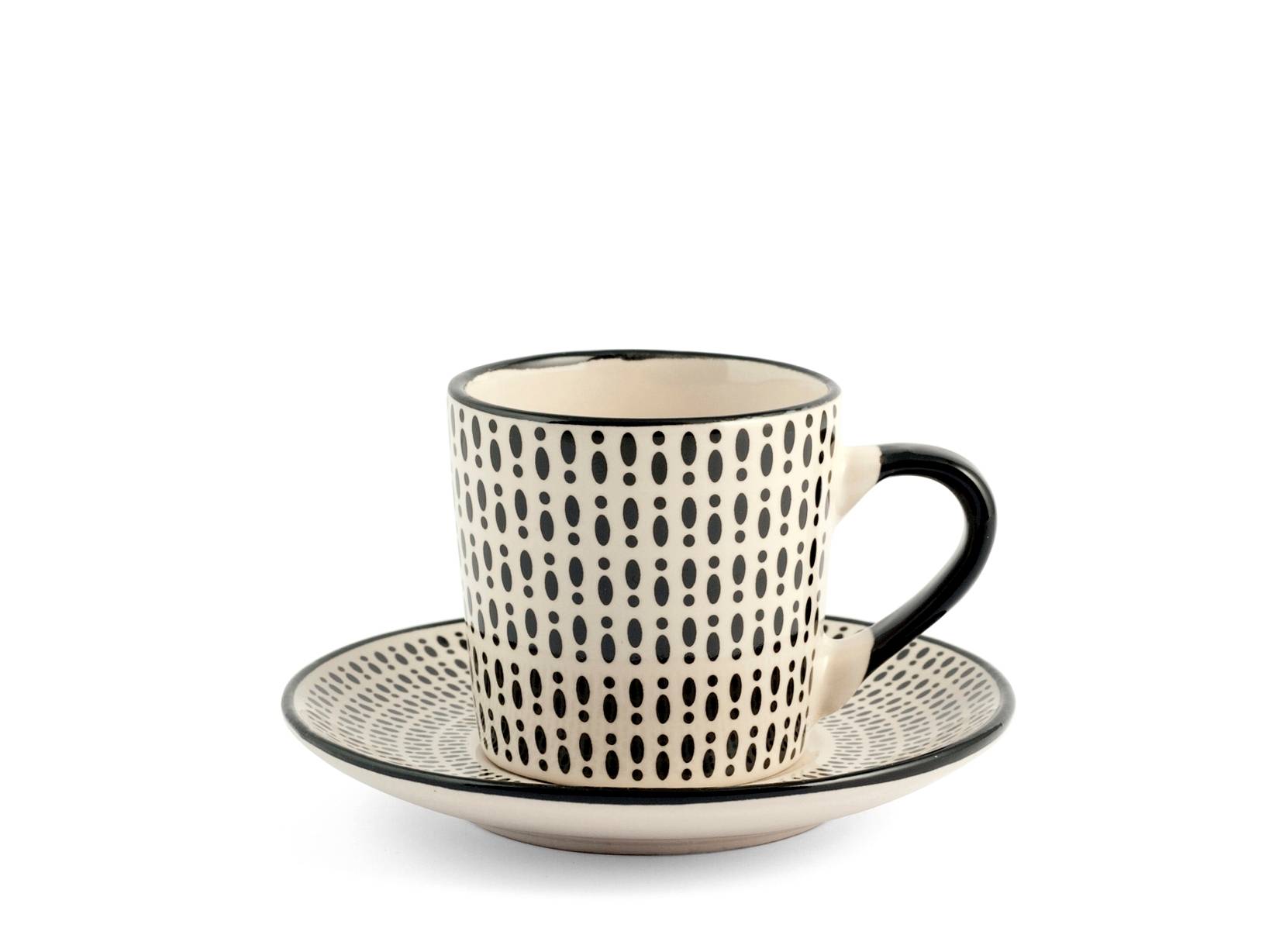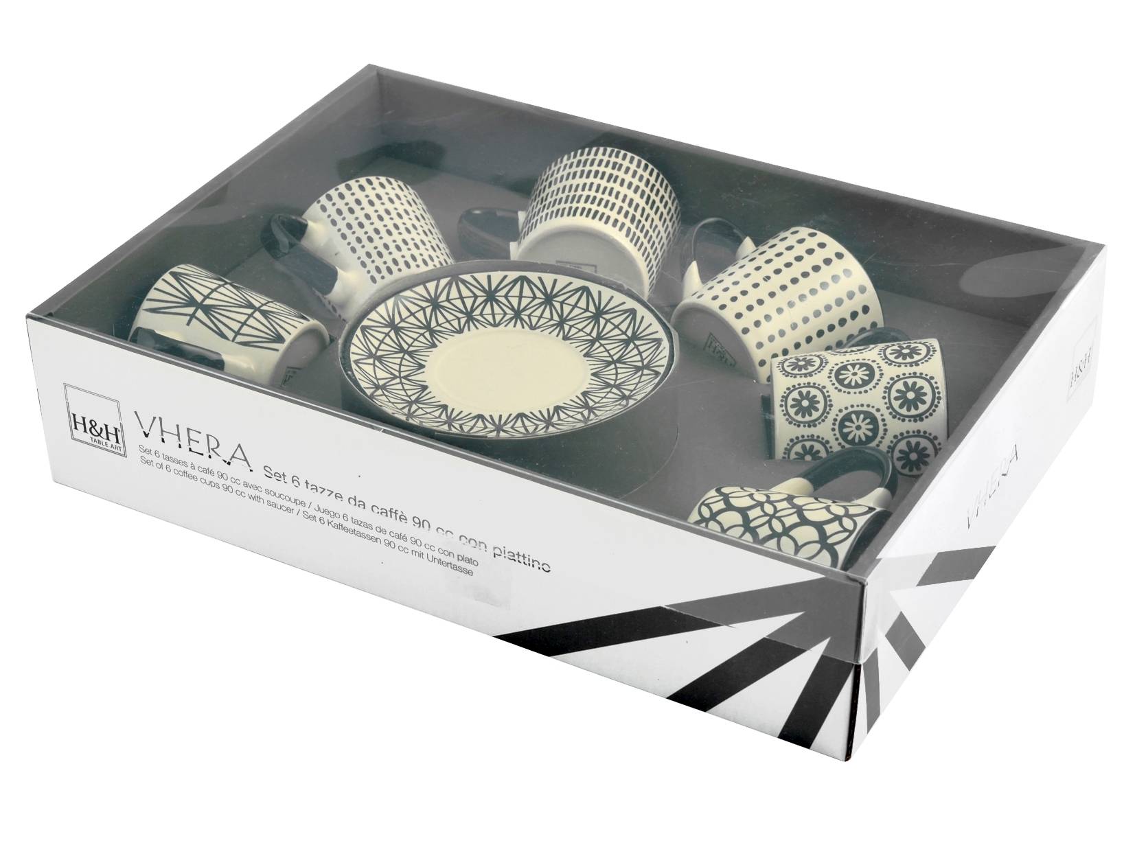 Set 6 tazze caffè in stoneware vhera con piatto cc90. Nelle tazze vhera il bianco e nero sono i protagonisti di decori stilosi ed eleganti che rendono il prodotto stesso un "Timeless style". La presenza del bianco di fondo esalta il disegno del nero: giochi geometrici, segni irregolari e fiori stilizzati che sembrano asterischi di promemoria di tutte quelle cose cui pensiamo quando ci prendiamo un momento di relax, per sorseggiare una fumante tazza di tè. Tazze caffè, tè, mug, jumbo, ciotola e 2 set tazze con piattino decorato. LINEA VHERA,VHERA,H&H,heh