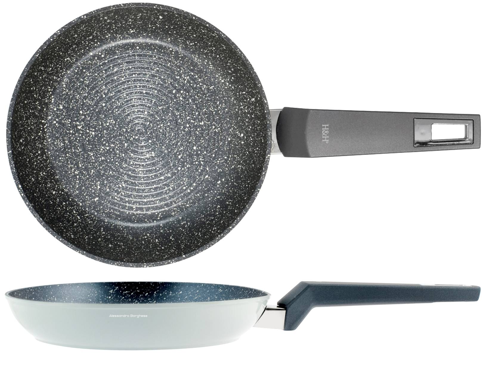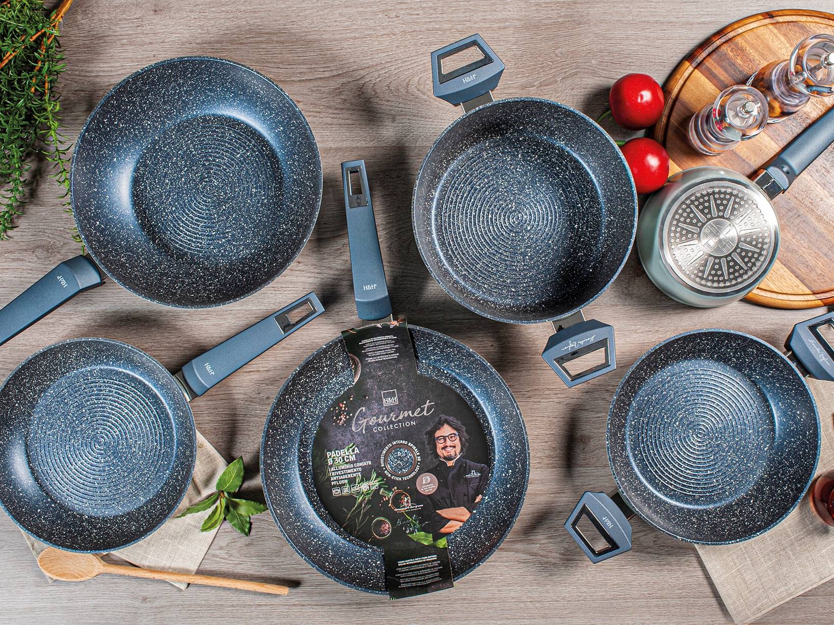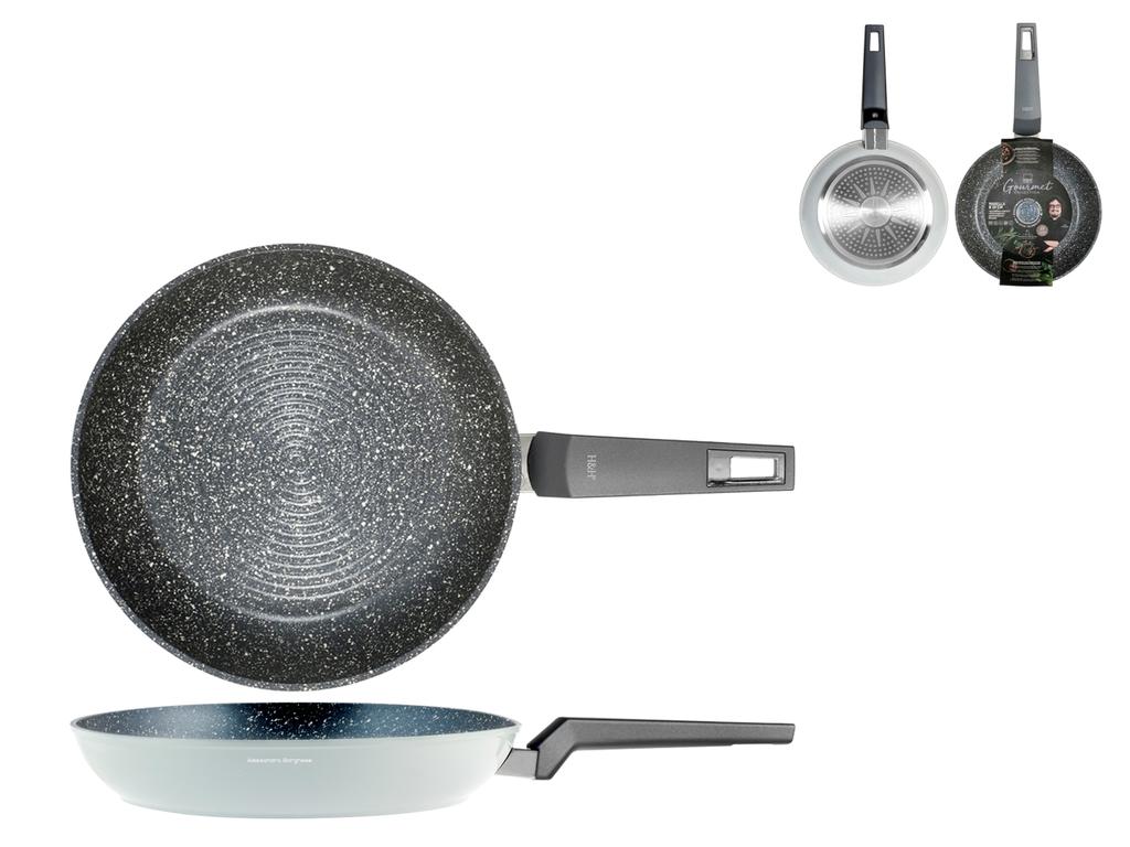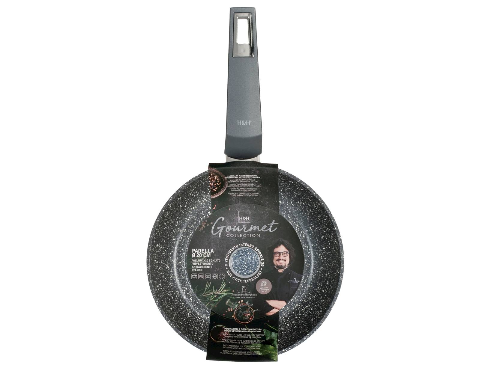 Padella gourmet in alluminio coniato con rivestimento pietra antiaderente pfluon a spirale. Adatta a tutti i piani cottura compresi vetro ceramica ed induzione. H&H,heh