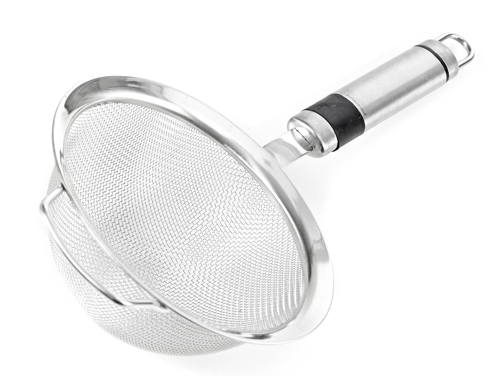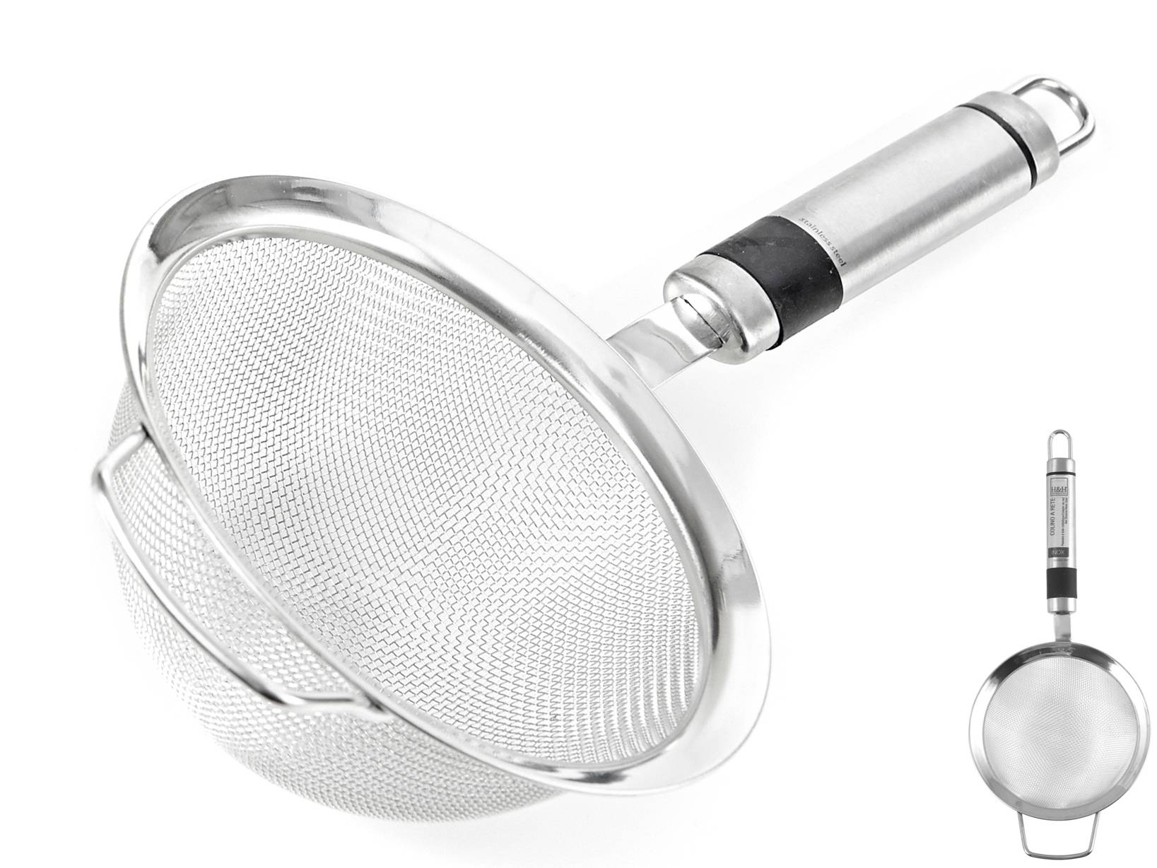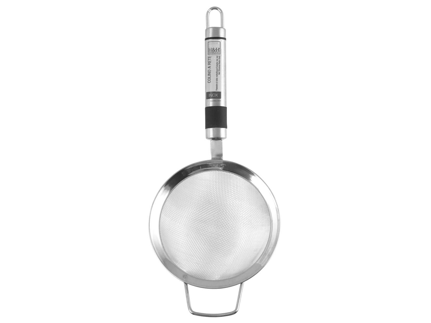 Colino Inox Top in acciaio inox con manico ovale cm12. Con una fine rete metallica, non assorbe odori o sapori, lavabile in lavastoviglie. La collezione utensili in acciaio inox include molti pratici strumenti da cucina per ogni possibile preparazione, accomunati da un design essenziale e moderno. Può essere appeso al gancio della barra da cucina per essere sempre a portata di mano. LINEA INOX TOP,H&H,heh