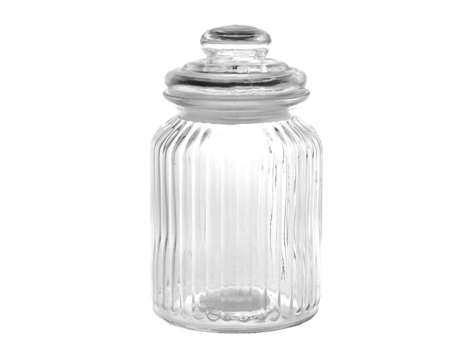Barattolo rigato in vetro con capacità di 1000 cc, progettato per conservare alimenti in grandi quantità. La capacità generosa è perfetta per stoccare pasta, cereali, farina e altri ingredienti. Il design rigato aggiunge un tocco di eleganza, mentre il vetro trasparente consente una facile visualizzazione del contenuto. Questo barattolo è lavabile in lavastoviglie per una pulizia senza sforzo.