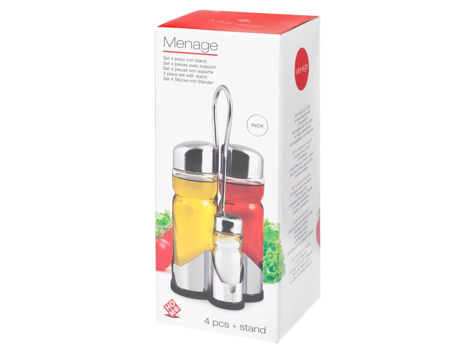 Oliera 4 pezzi in vetro con stand e tappi in acciaio inox. Composta da: 2 oliere con salvagoccia cm 5x16 h; 2 salini cm 3x9 h; 1 stand cm 11x10,5x22 h. LINEA HOME MENAGE,HOME MENAGE,HOME,asparagi