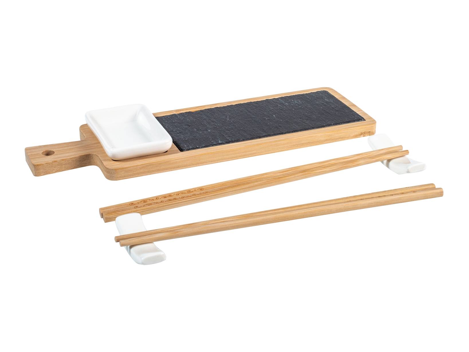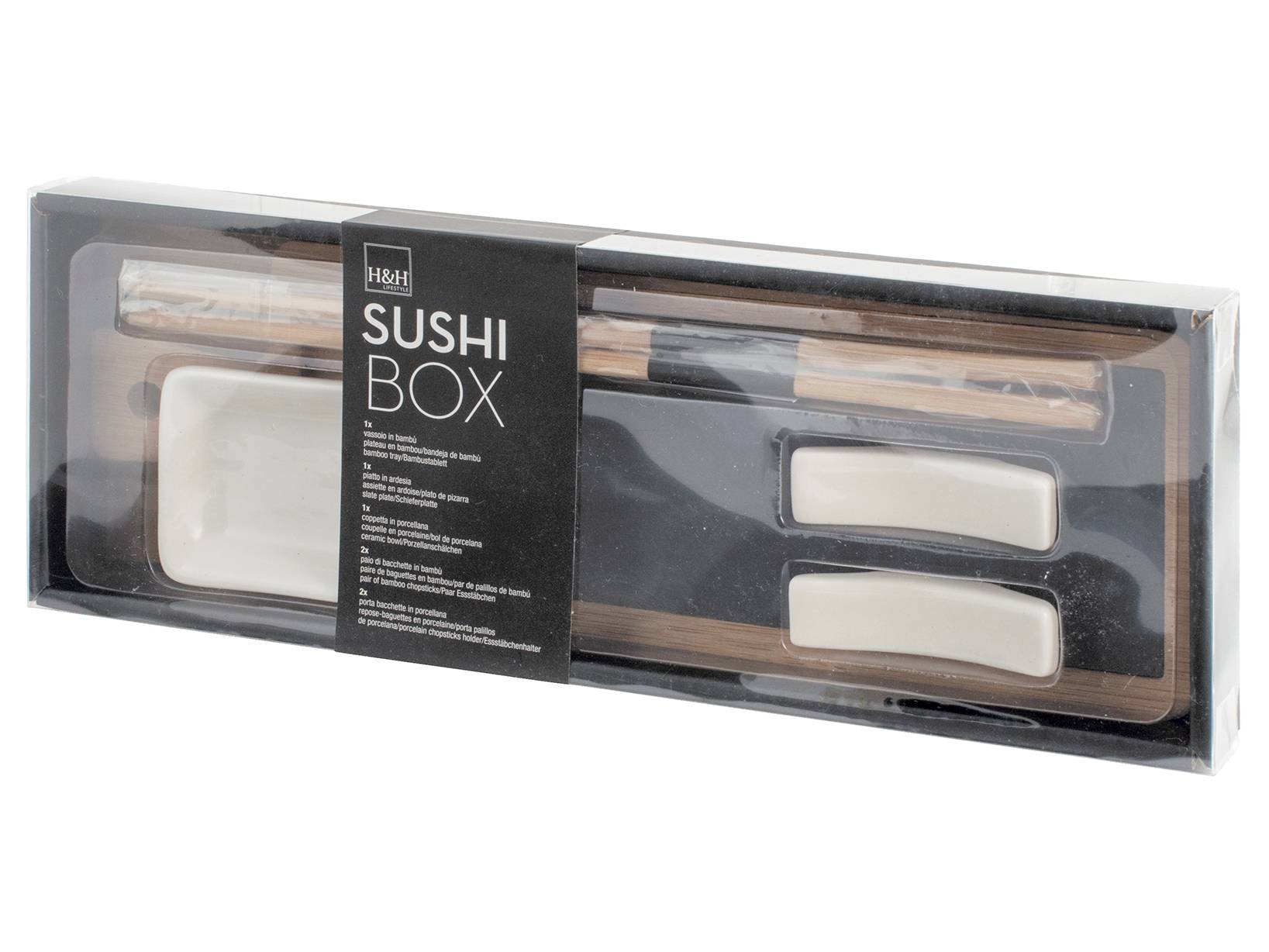 Set 9 pezzi sushi box in ardesia e bambu' cm 9x28. Composto da:1 vassoio bambù cm 27,5x8,5;1 piatto in ardesia cm 21x7; 1 coppetta in porcellana cm 7,5x5; 2 paia di bacchette cm 24; 2 porta bacchette cm 6x1,5. Coppetta e portabacchette lavabile in lavastoviglie e idonea al microonde. LINEA SUSHI BOX,SUSHI,H&H,heh