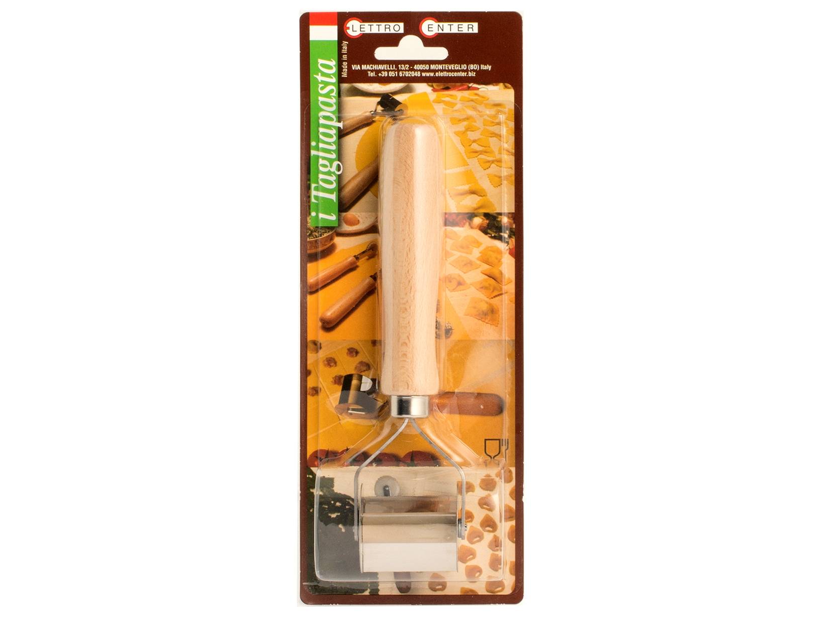 Tagliapasta quadrato con 3 lame in acciaio inox lisce e manico in legno. Dimensioni: mm 38.