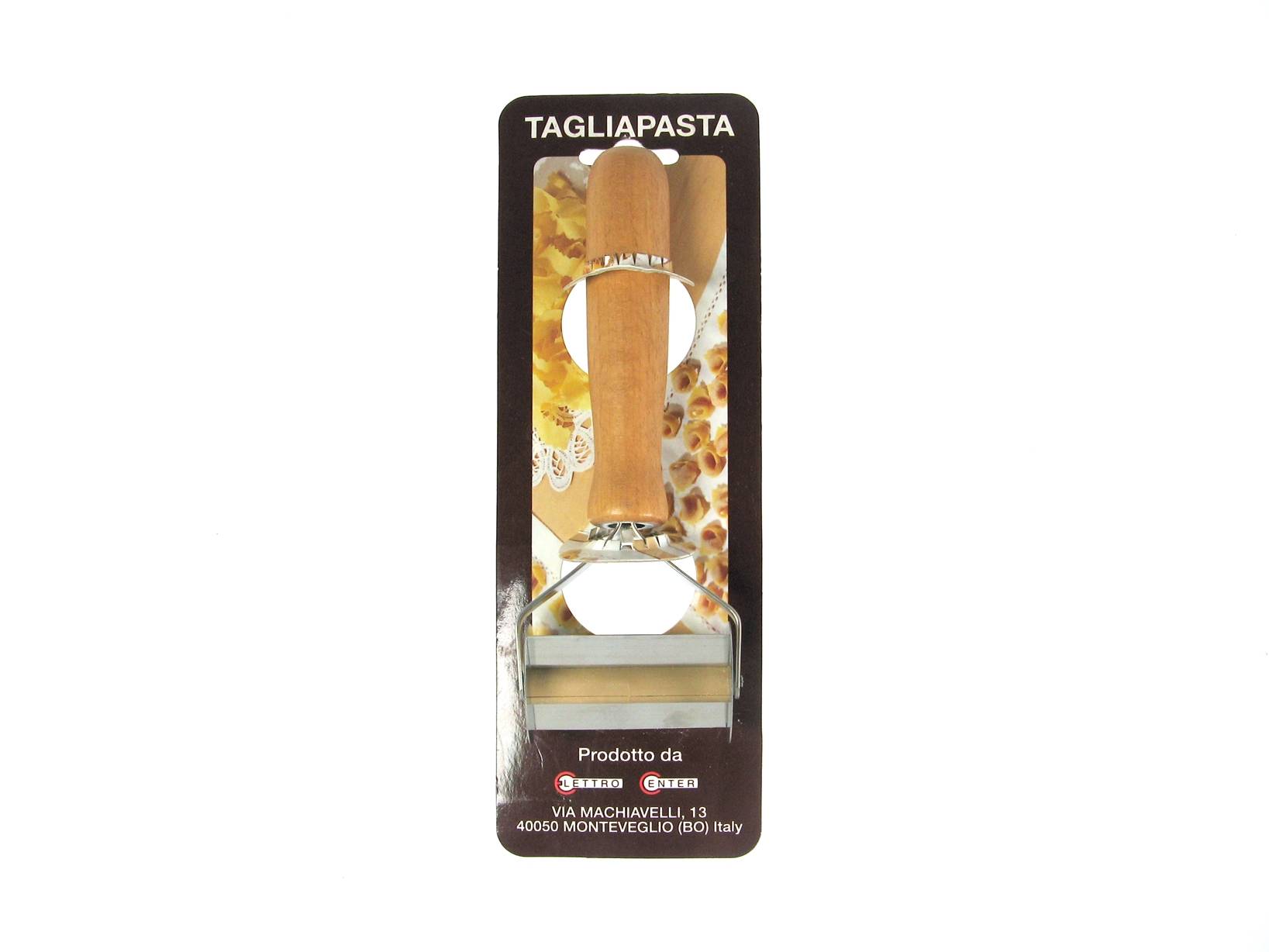 Tagliapasta quadrato con 2 lame lisce in acciaio inox e manico in legno. Dimensioni: mm 56.