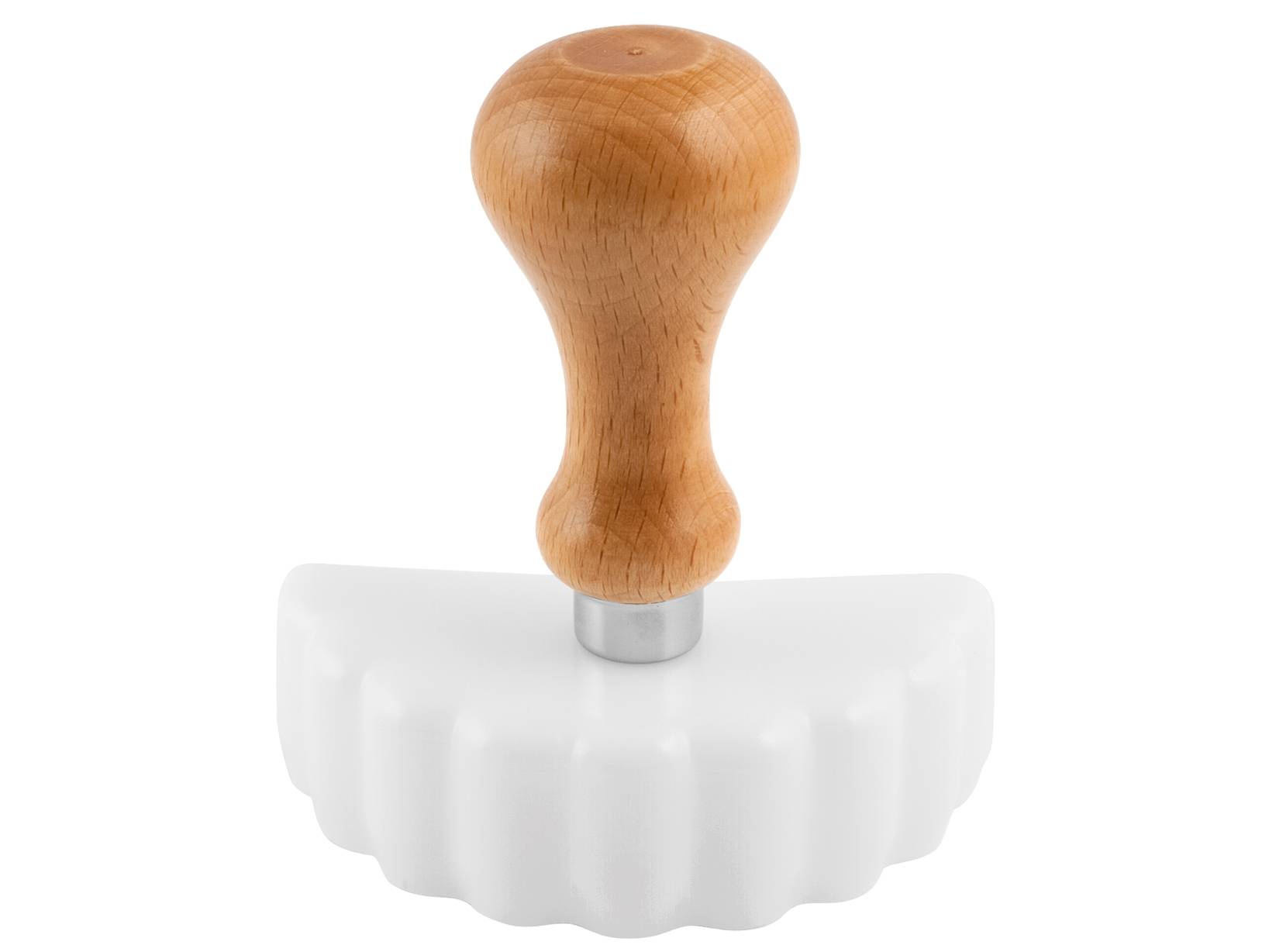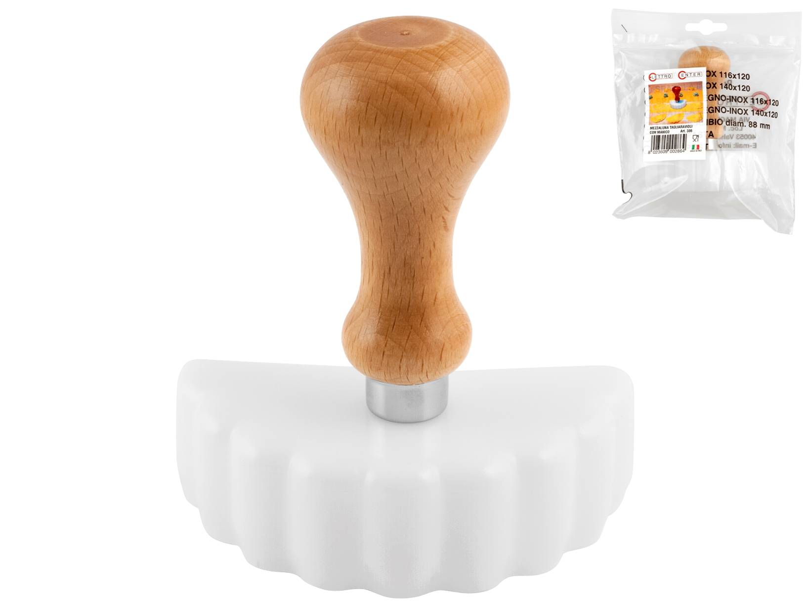 Questo tagliaravioli a forma di mezza luna con manico in legno è ideale per creare ravioli con un taglio distintivo a forma di mezza luna. Con il suo design ergonomico e il manico in legno, offre una presa comoda e un aspetto elegante, perfetto per preparazioni artigianali e festose. LINEA I TAGLIAPASTA