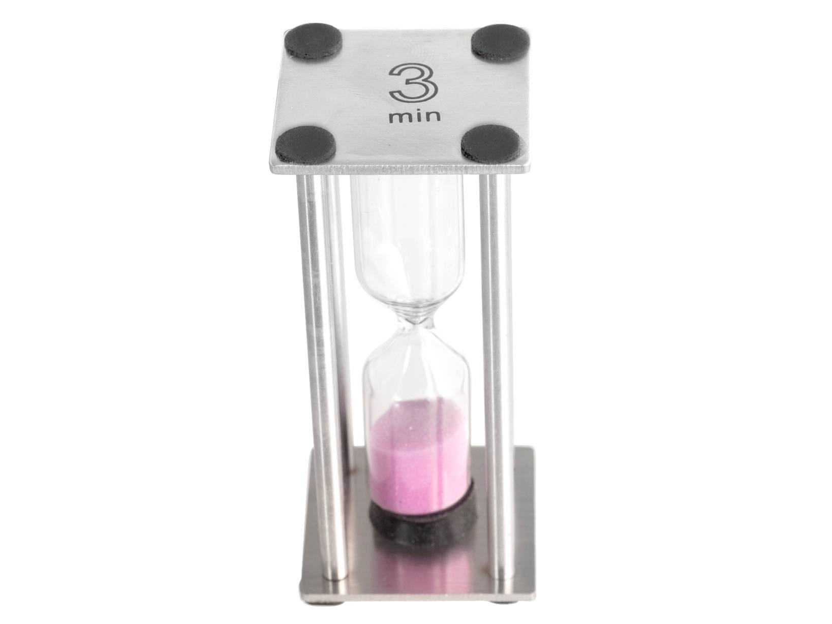Clessidra in acciaio inox e vetro con intervallo di tempo di 3 e 5 minuti e sabbia di colore rosa.