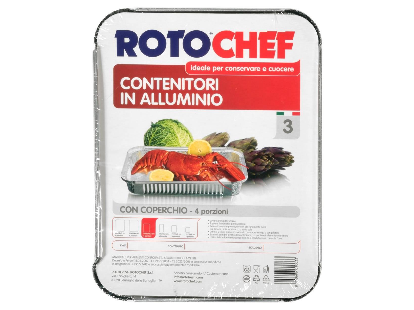 Questo set include 3 contenitori rettangolari in alluminio con dimensioni di 22x17 cm e 5 cm di altezza, completi di coperchi in carta. Sono perfetti per il trasporto e la conservazione di alimenti cotti, offrendo praticità e protezione. La qualità dell'alluminio assicura una cottura uniforme e una lunga durata. Made in Italy, sono ideali per l'uso quotidiano. LINEA ROTOCHEF
