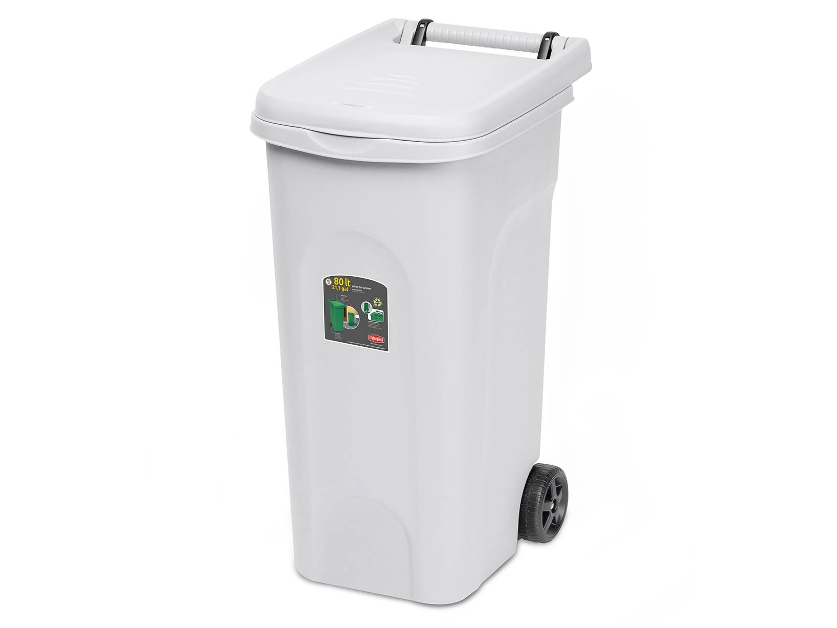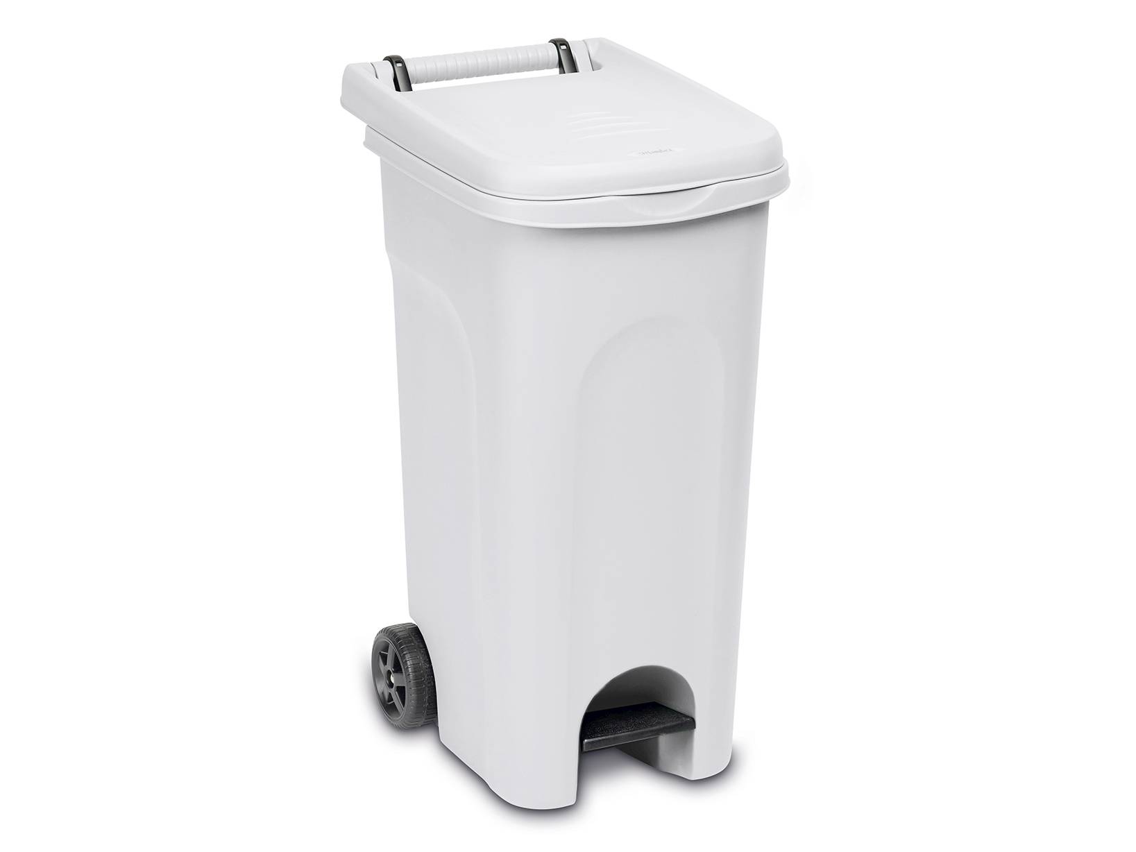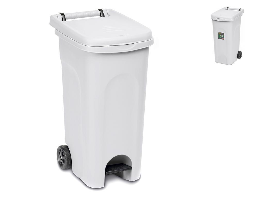 Questo bidone per immondizia ha una capacità di 120 litri ed è dotato di ruote e pedale per un facile trasporto e utilizzo. La struttura in plastica bianca è robusta e include un anello ferma sacchetto per maggiore praticità nella gestione dei rifiuti. Adatto per ambienti domestici e professionali.
