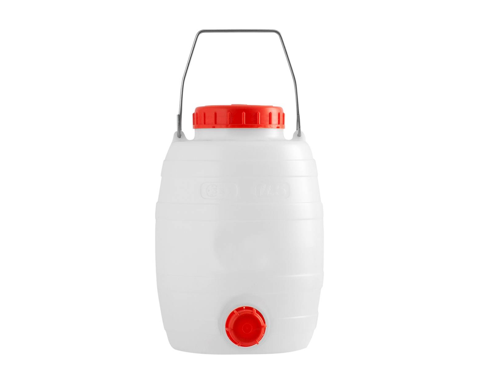 Fustino botticella con rubinetto, capacità 5 litri, in plastica bianca con maniglia in filo cromato. Ideale per liquidi alimentari.
