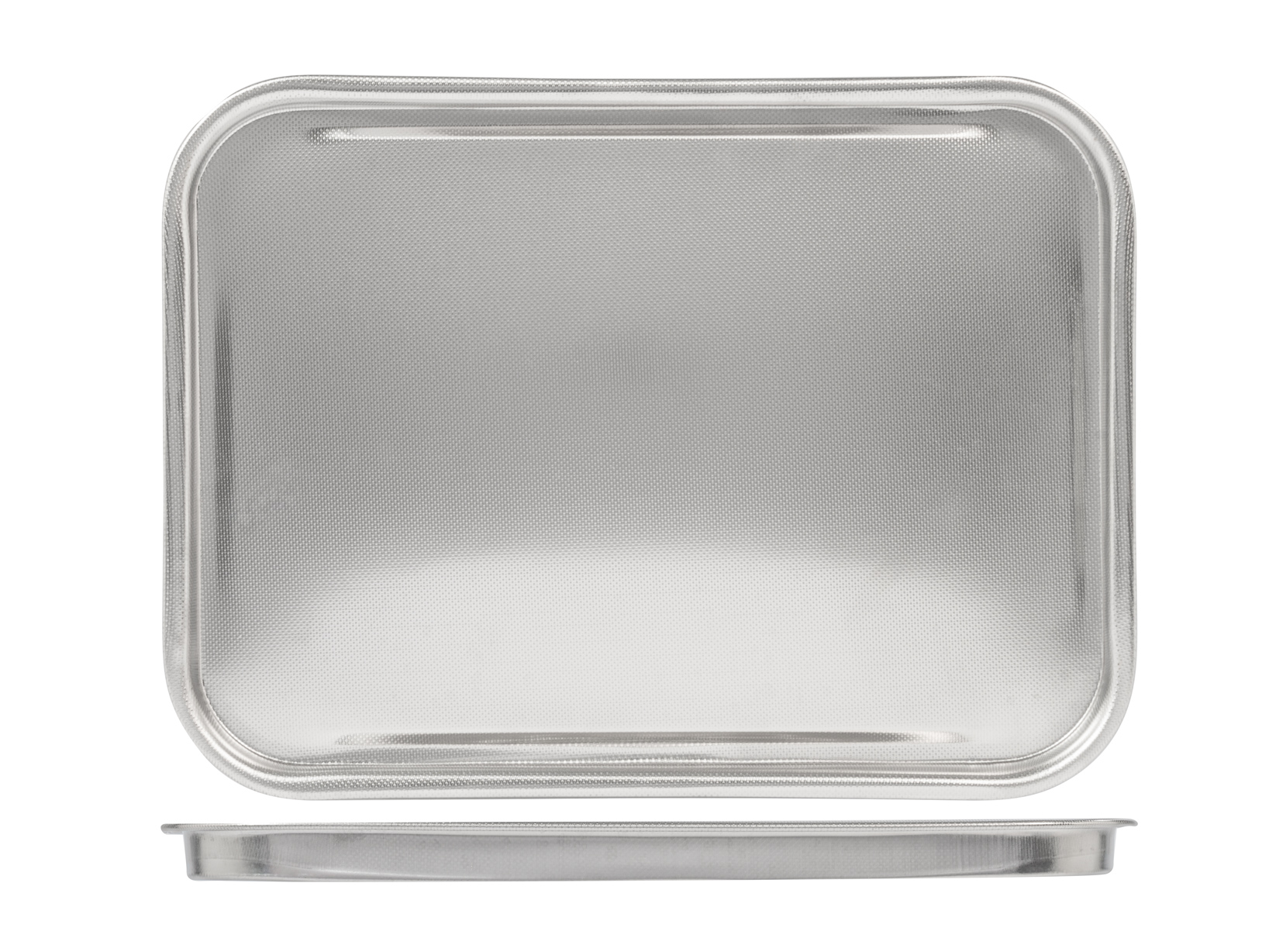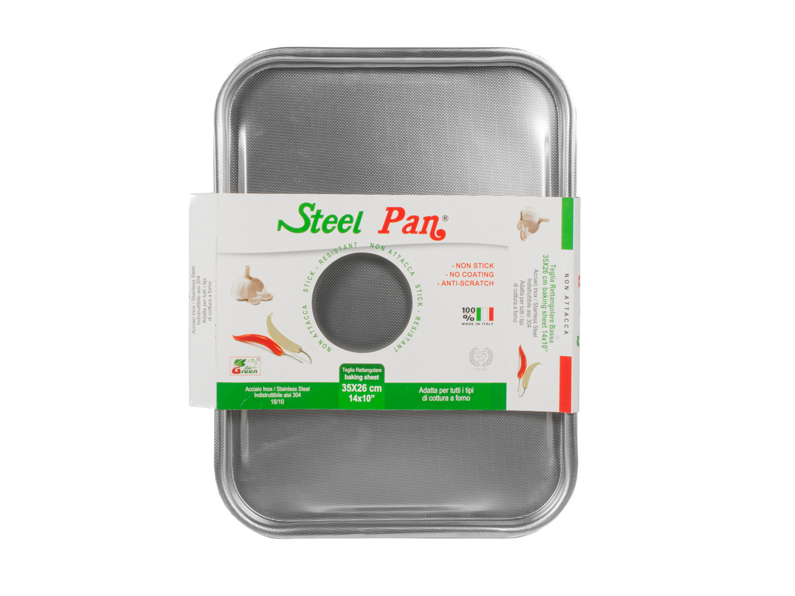 Teglia rettangolare bassa non stick da 35 cm in acciaio inox, Made in Italy, ideale per preparazioni al forno.