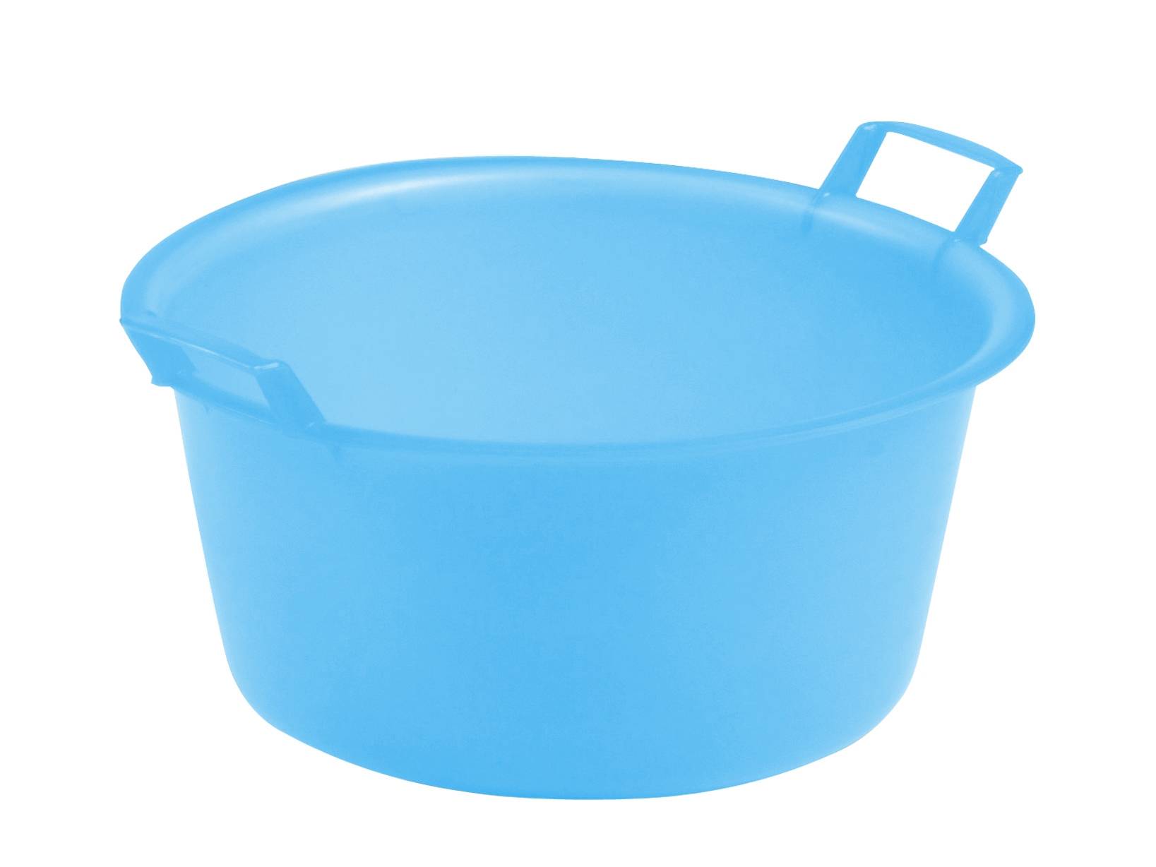 Bacinella tonda in poelitene azzurra. Dimensioni: cm 55x26hx49. Questa bacinella in plastica dura è pratica e ideale per l'uso quotidiano casalingo di ogni genere. I manici sono inglobati nella struttura del prodotto per garantire la presa e la comodità.