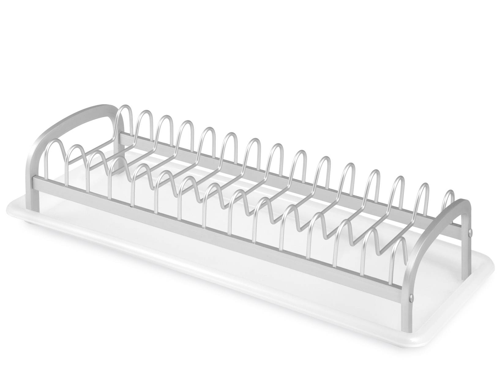 Scolapiatti con 14 posti in alluminio anodizzato compreso di vassoio in plastica colore bianco e piedini antiscivolo. Composto da: scolapiatti cm 38,5x14,5x9 h; vassoio cm 42,5x18x2 h. H&H,heh