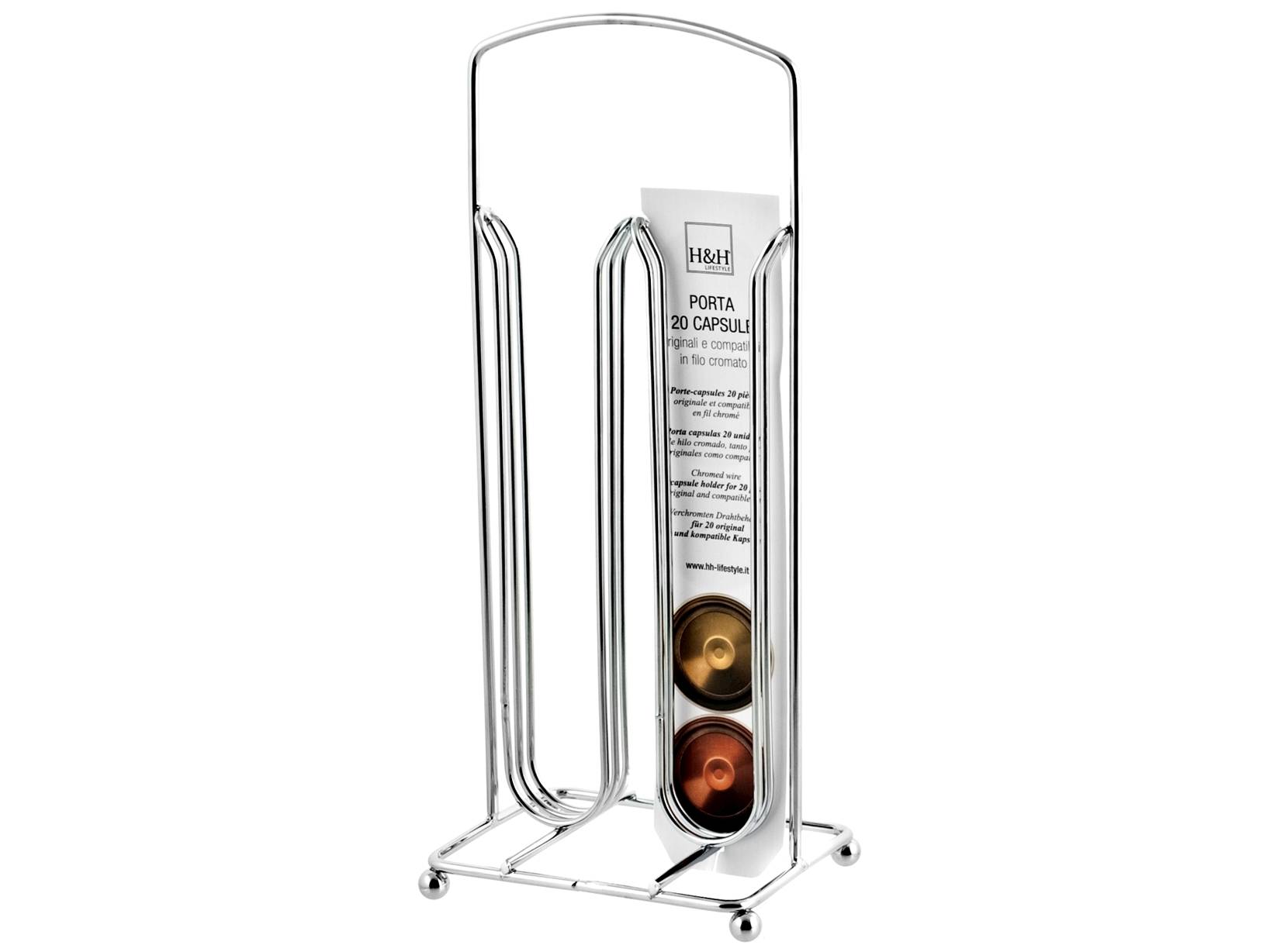 Porta capsule da caffè in filocromato, progettato per contenere fino a 20 capsule. Con dimensioni di 11x9x26,5 cm, è ideale per organizzare la tua collezione di capsule, mantenendole sempre a portata di mano. H&H,heh