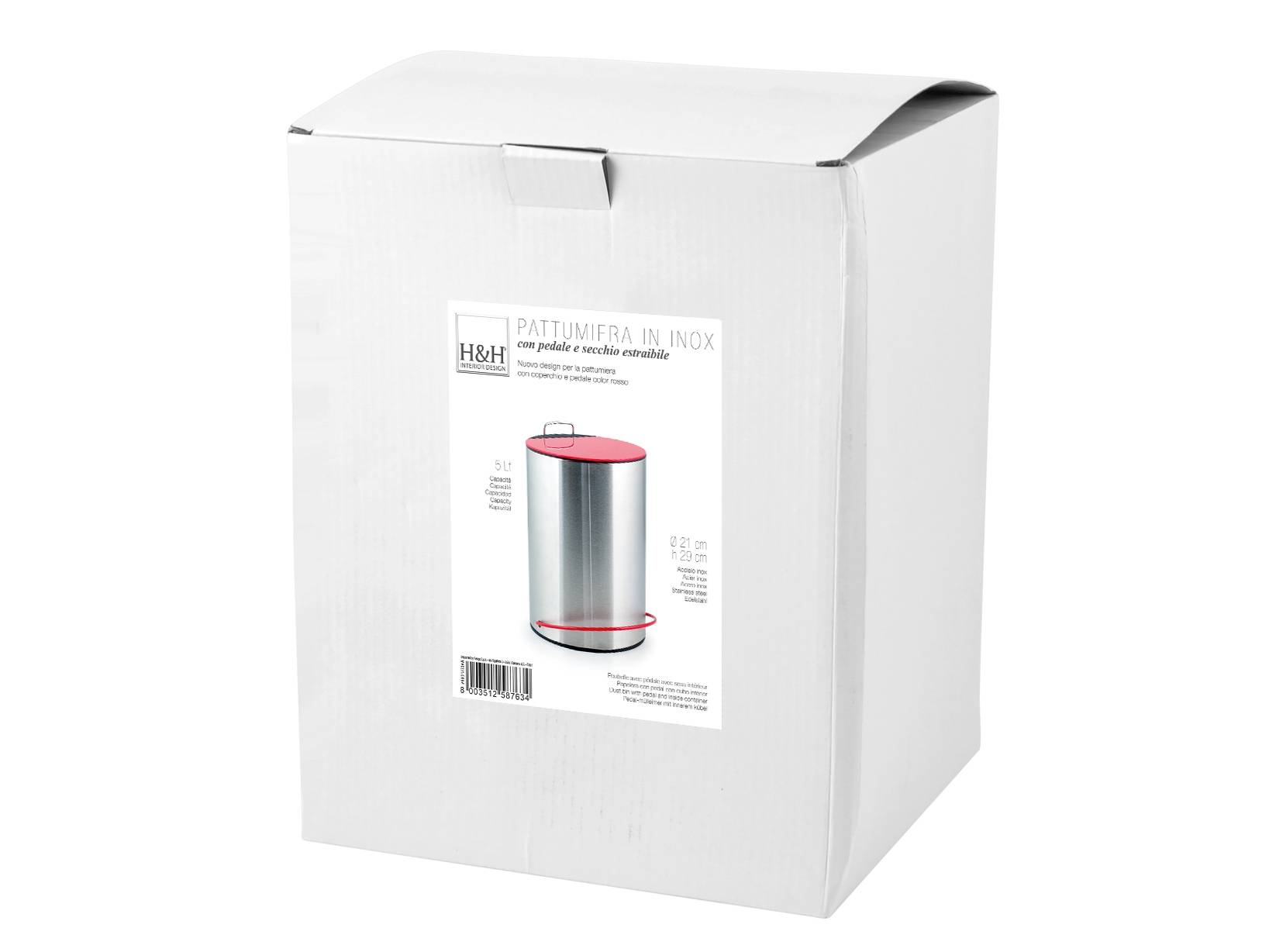 Innovazione e funzionalita', cura dei dettagli e delle forme: sono questi i tratti distintivi di un oggetto per la casa di qualita'. La pattumiera e' dotata di coperchio e di un pedale per l'apertura rossi che contrastano la superficie in acciaio inox satinato. Facile da trasportare grazie al manico sulla sommita' e semplice da vuotare con il cestino interno rimovibile. Ideale per tutti gli ambienti della casa, come il bagno e la cucina. Capacita' 5 l. Disponibile in altre misure. H&H,heh