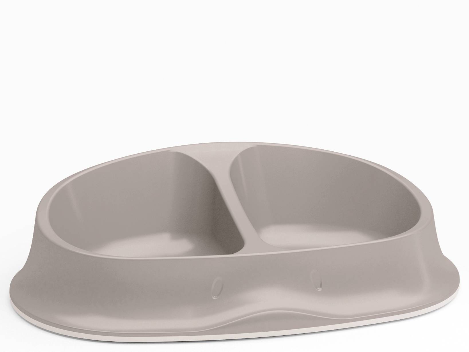 Ciotola chic doppia in polipropilene color tortora, ogni ciotola ha una capacità di 0,25 litri. Ideale per servire cibo e acqua contemporaneamente. Made in Italy. LINEA CHIC PETS